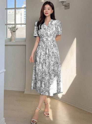 V-Neck Short Sleeve Black&White Ink Print Drawstring Waist Dress