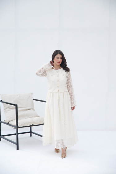 The 'Ivory Grace Two-Piece Set' from Parien House brings a vintage charm with a modern twist. This ensemble features intricate lace detailing across the outfit. The outerwear and skirt are fully lined except for the sleeves, maintaining a blend of modesty with a hint of allure. The outerwear is accentuated with functional buttons and pockets, while the skirt showcases elegant box pleats and a discreet side zipper for a seamless fit.