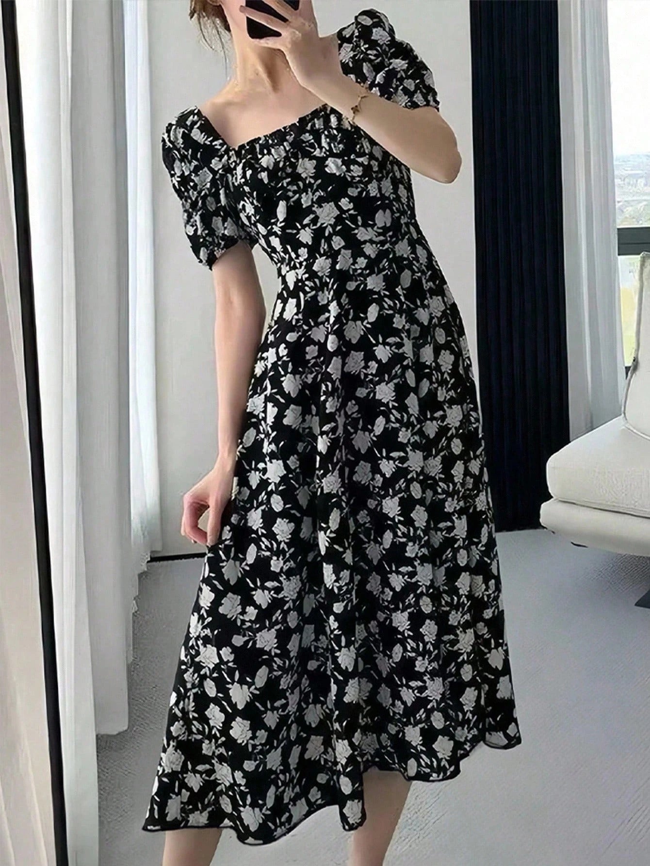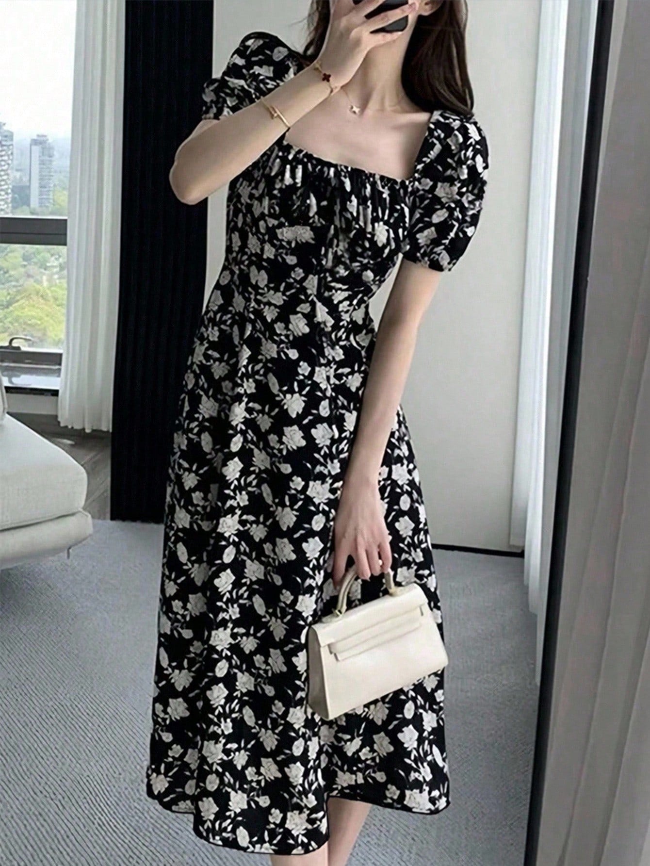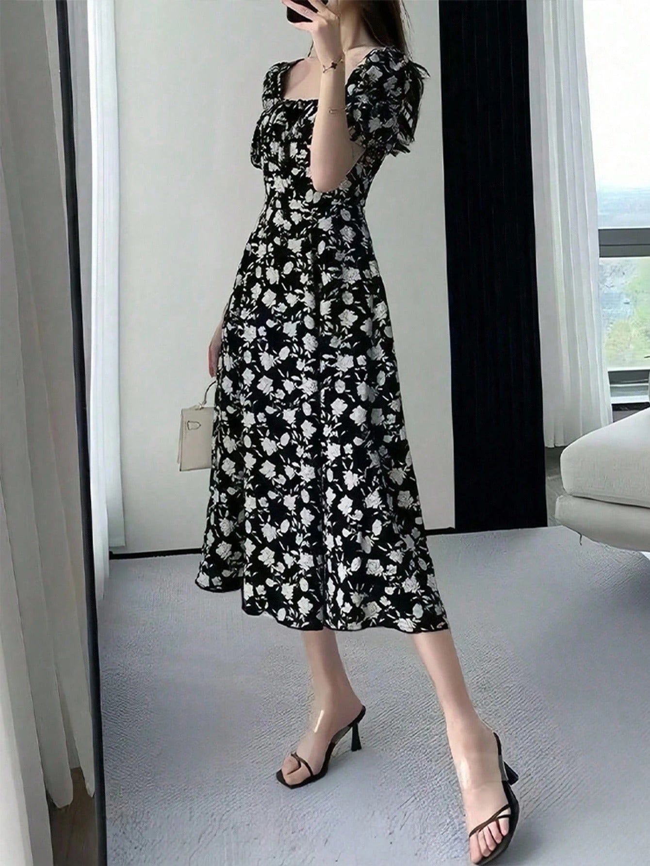 Ditsy Floral Square Neck Elegant Short Sleeve Dress