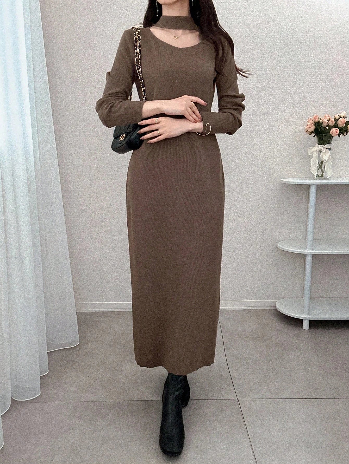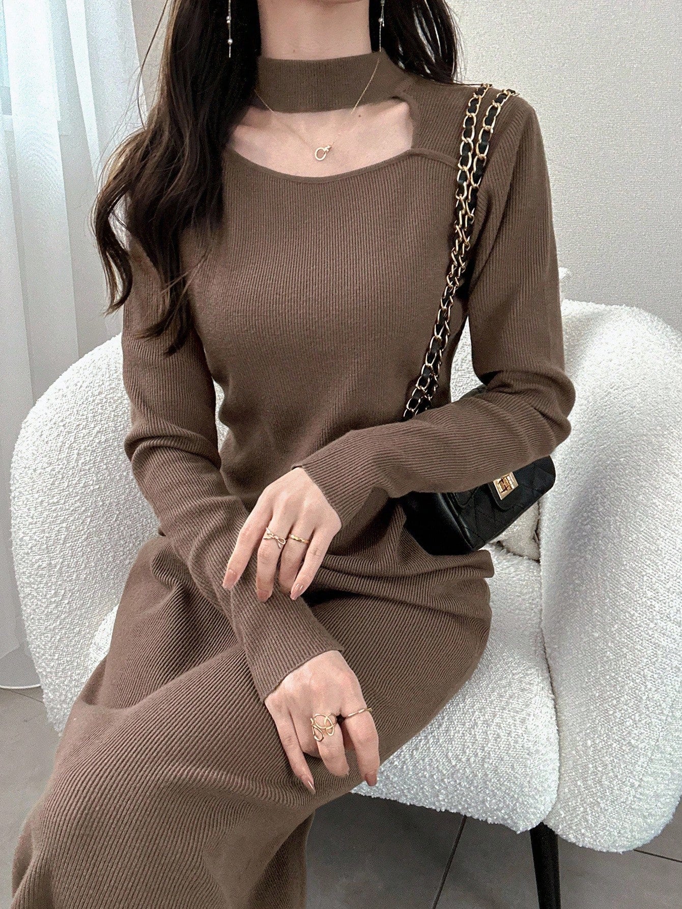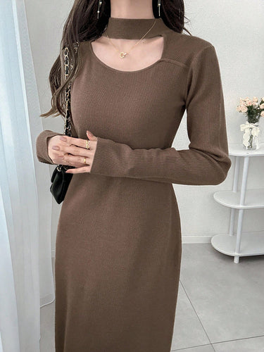 Brown Hollow Out High Neck Long Sleeve Slimming Dress