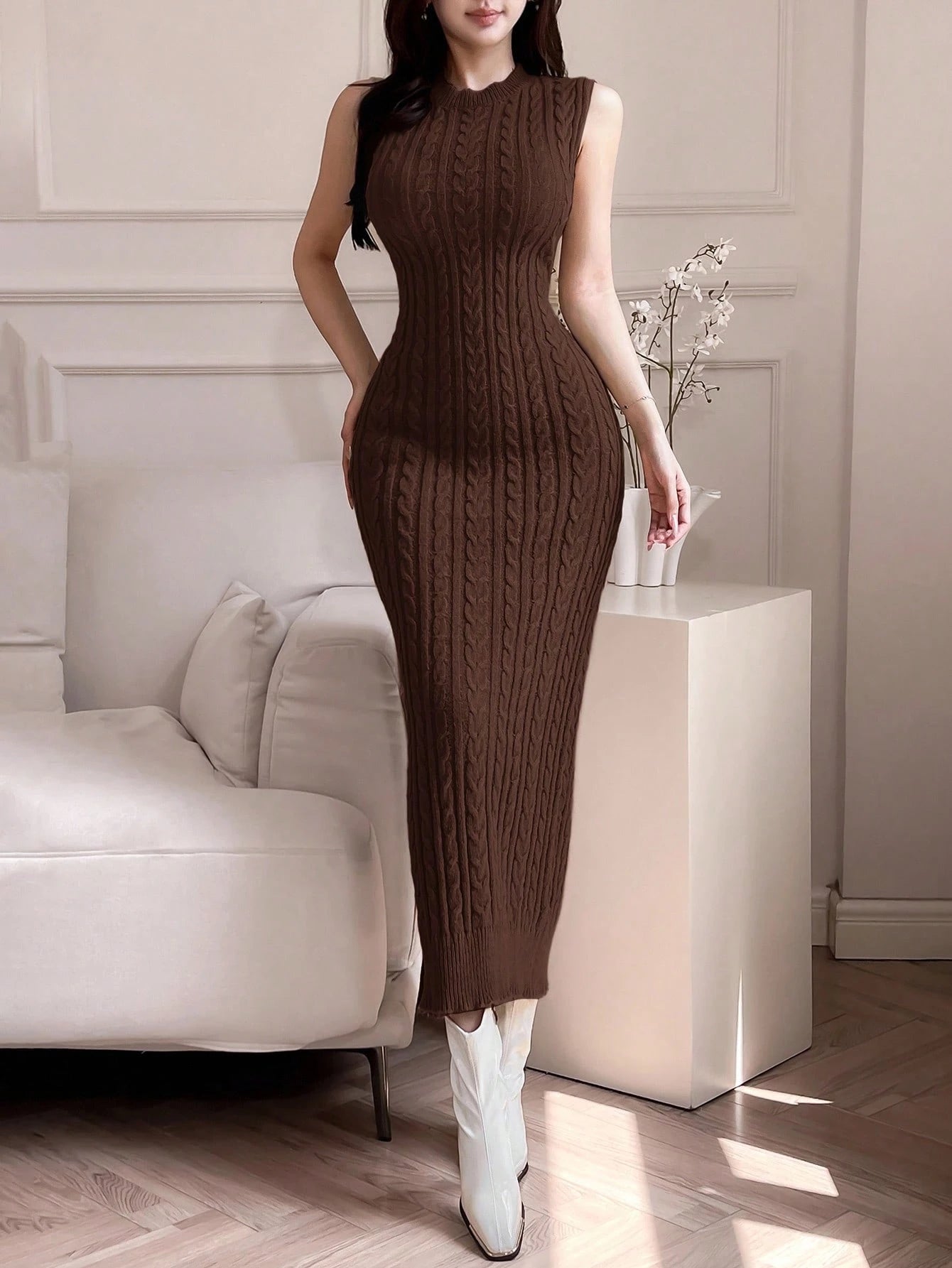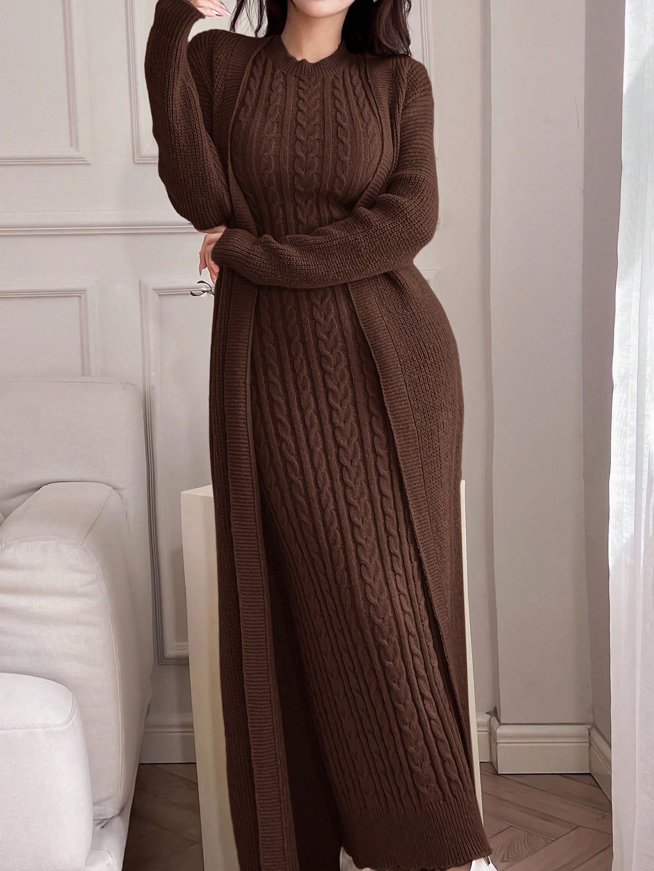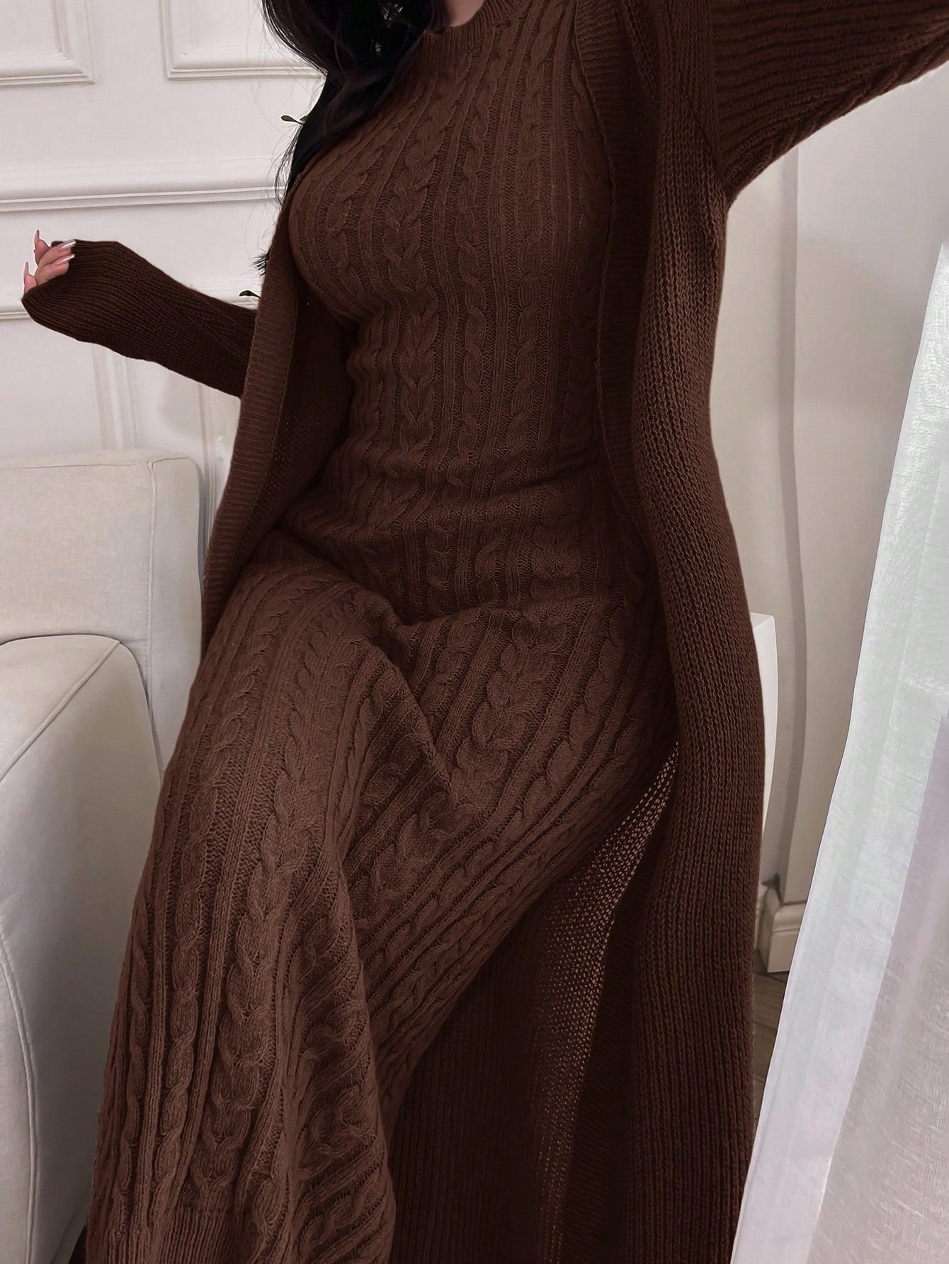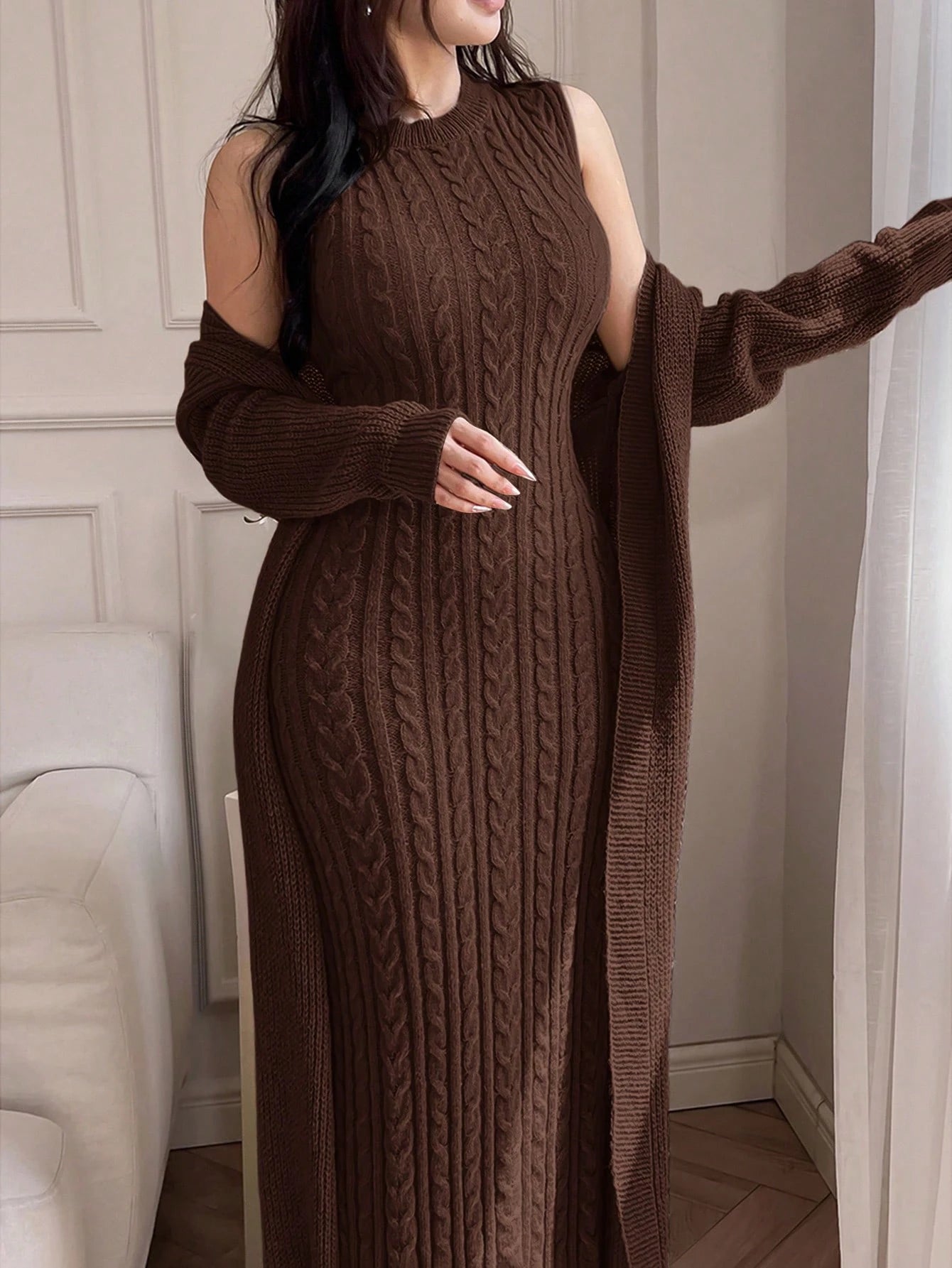 Stand Collar Cable Sleeveless Dress& Long Sleeve Cardigan Set