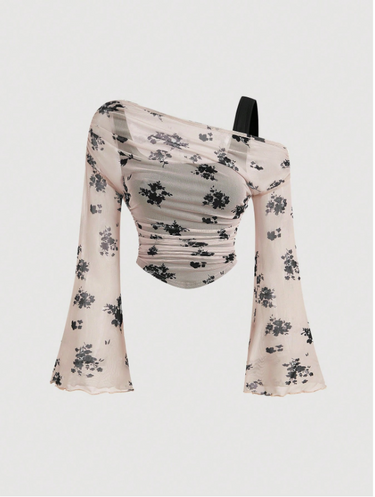 Mesh Printed Flare Sleeve Fitted Crop Top