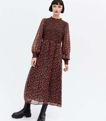 Inject winter prints into your wardrobe this season with our Floral Chiffon Shirred High Neck Midi Dress from a sheer floaty fabric, features include a shirred bodice and shirred cuffs. Layer it with your winter stockings, leatherette jacket and suede pumps for a trending outfit.