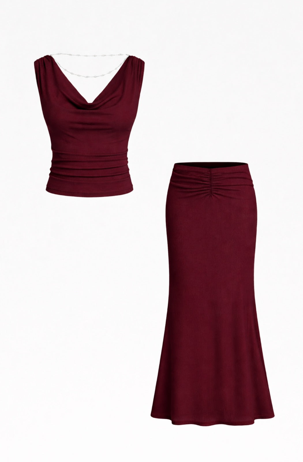 Chain Decor Draped Neck Sleeveless Top&Fishtail Hem Midi Skirt( Pre-order)