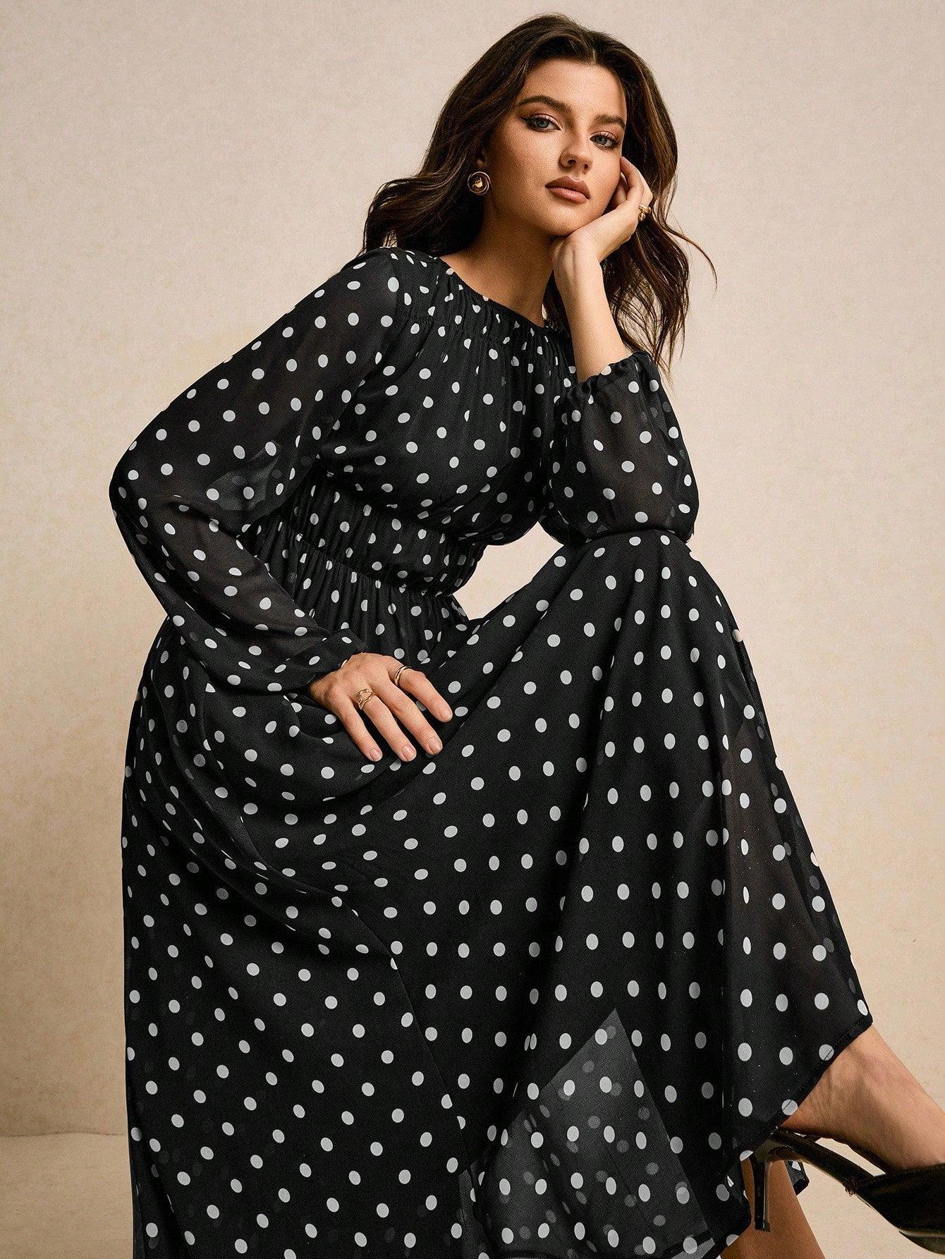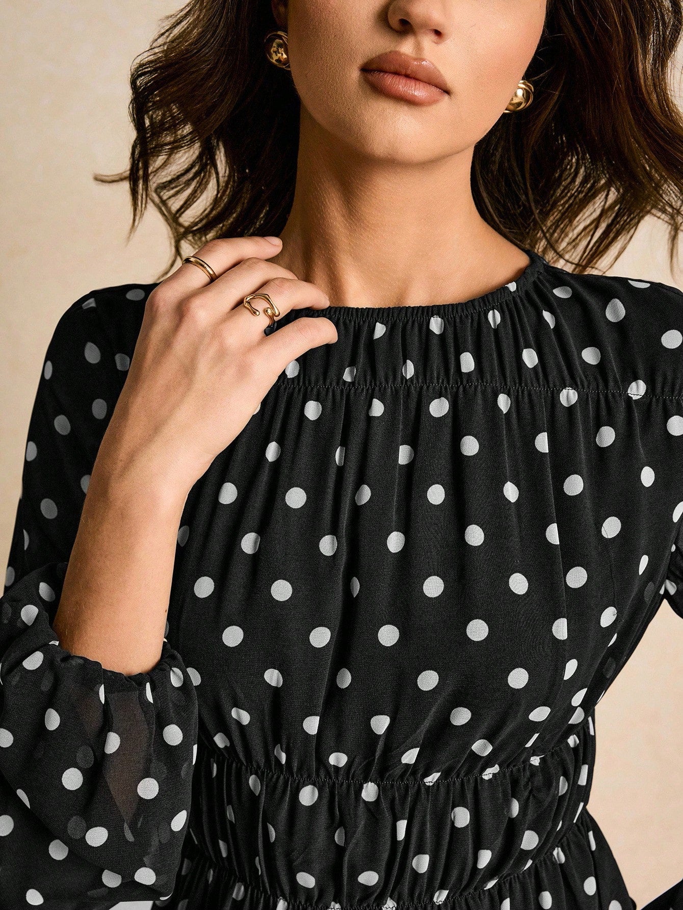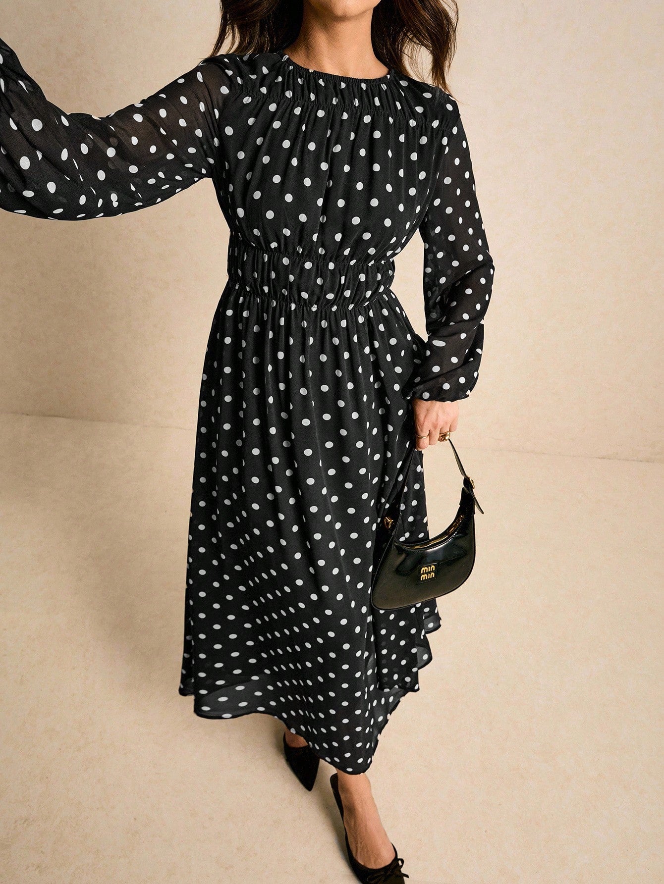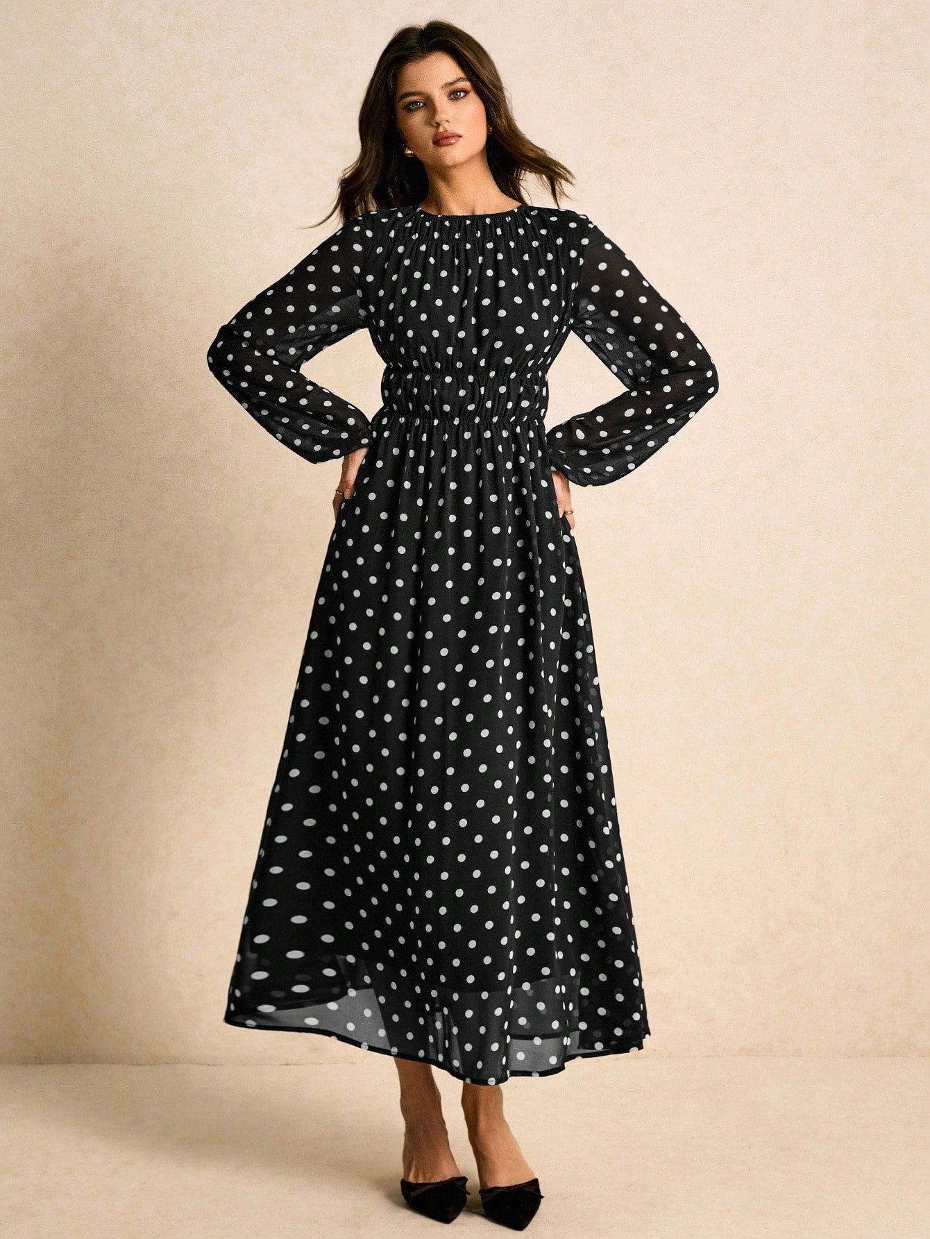 Polka Dot Print Round Neck Lantern Sleeve Ruched Long Dress