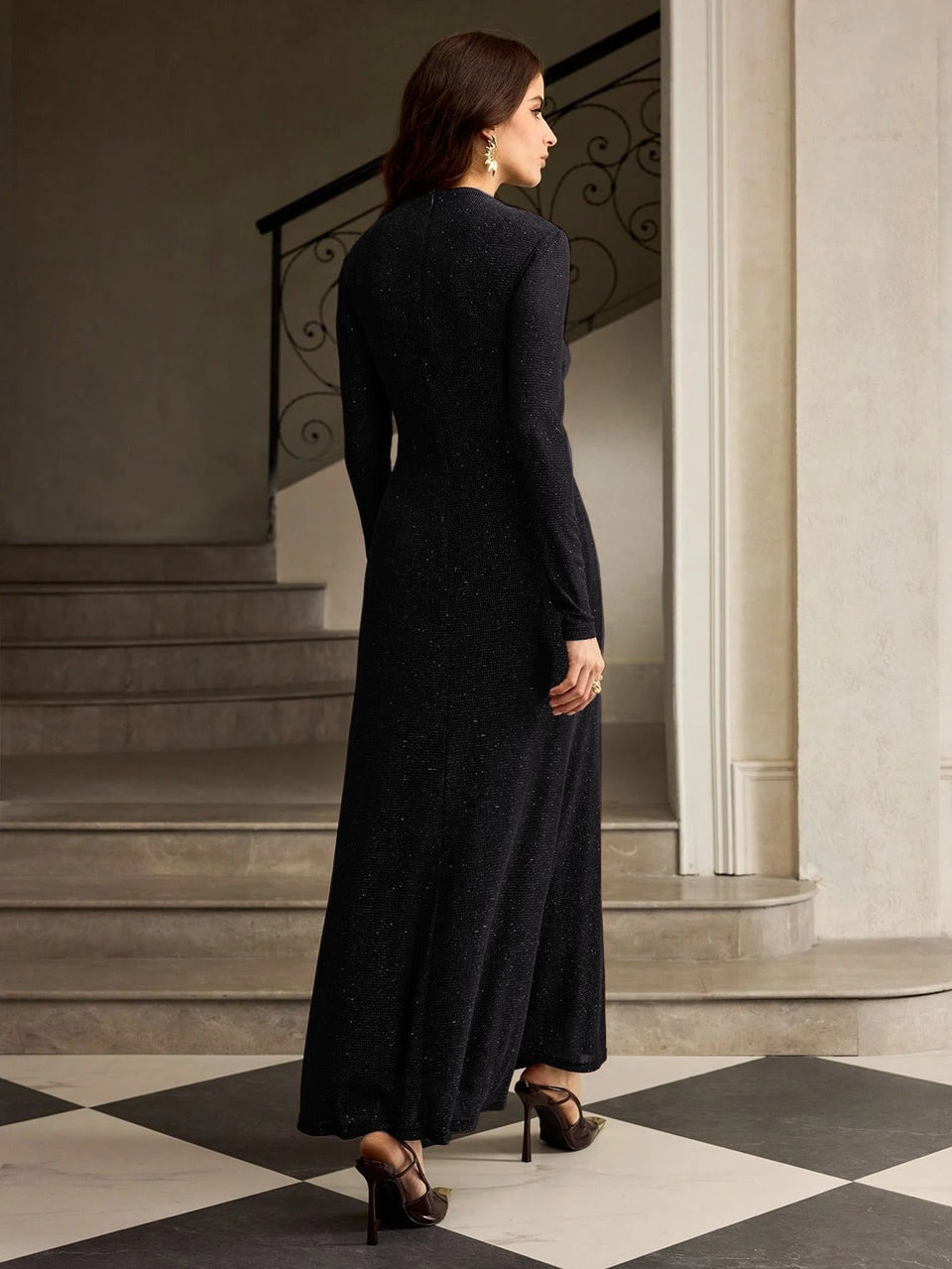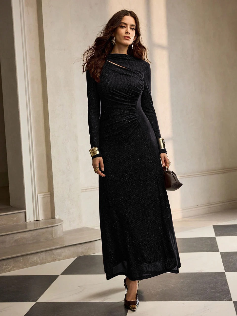Parien Ruched Fitted Long Sleeve Black Dress