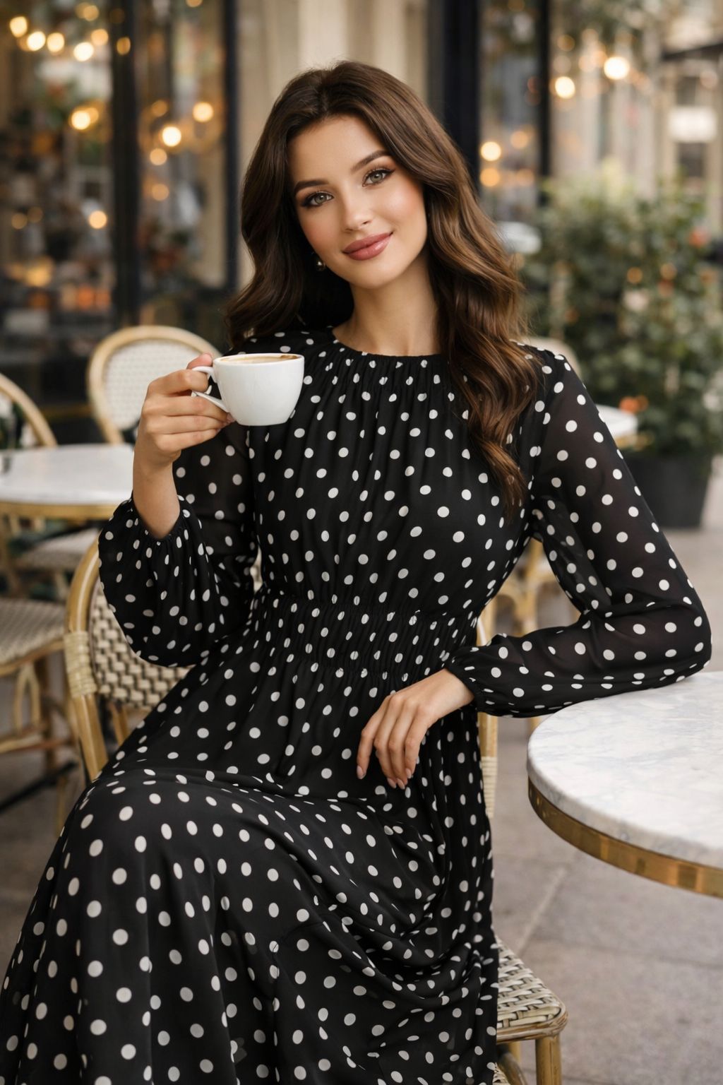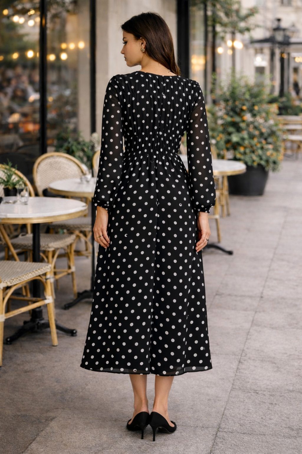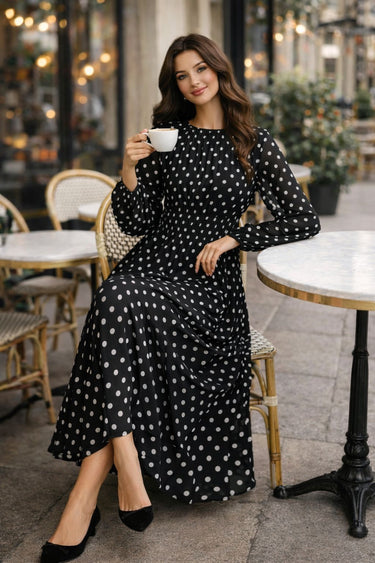 Polka Dot Print Round Neck Lantern Sleeve Ruched Long Dress