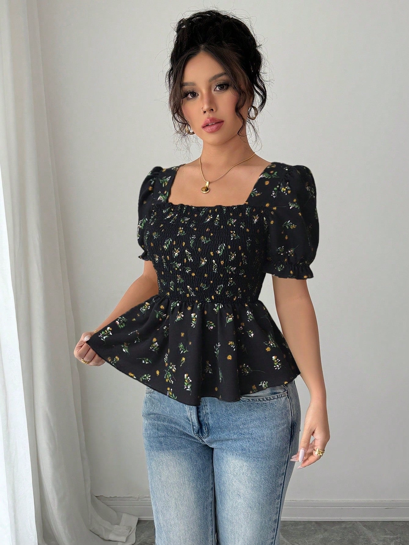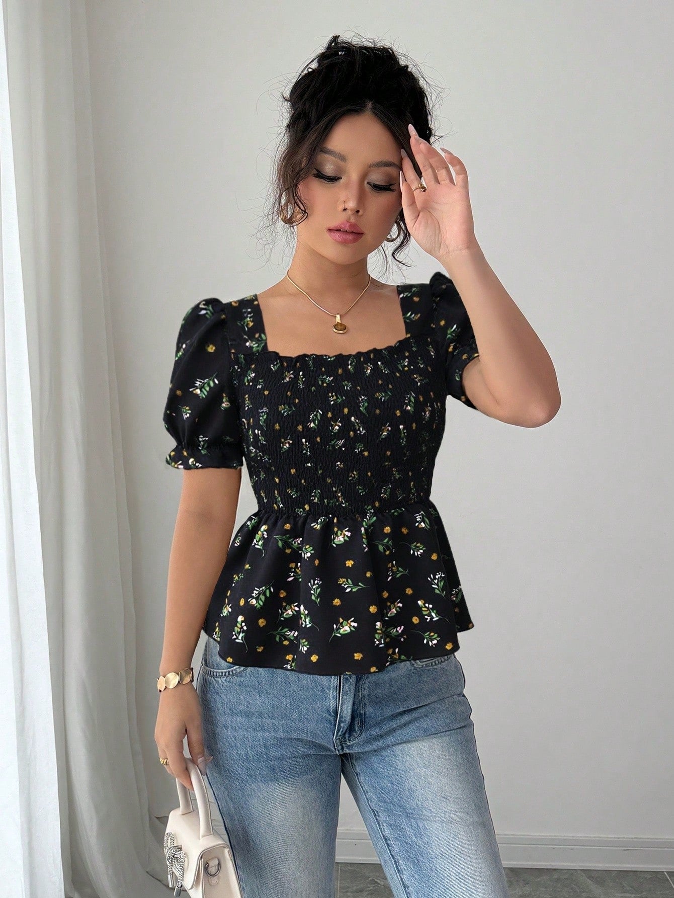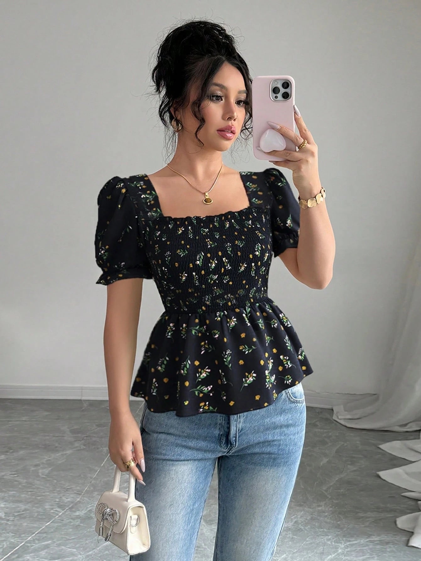Elegant Mini Ditsy Floral Silk Slim Fit Blouse