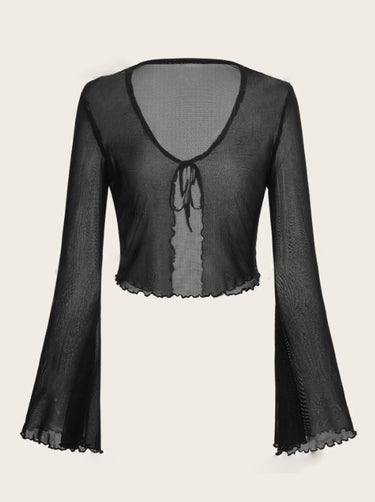 Parien Tie Front Lettuce Trim Trumpet Sleeve Mesh outwear Top