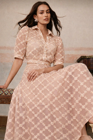 Parien V-Neck Floral Embroidered Puff Sleeve Top And Skirt