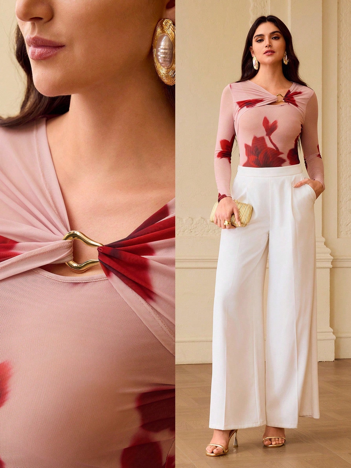 Metal Ring Decor Floral Print Long Sleeve Fitted T-Shirt