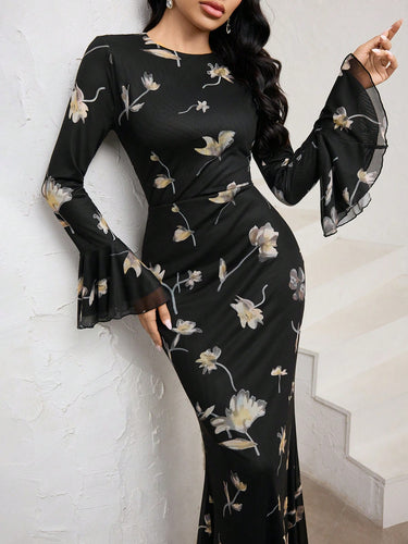 Floral Print Trumpet Sleeve Fishtail Hem Dress