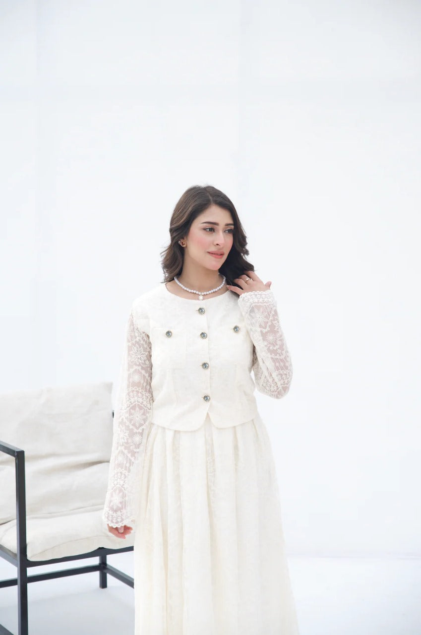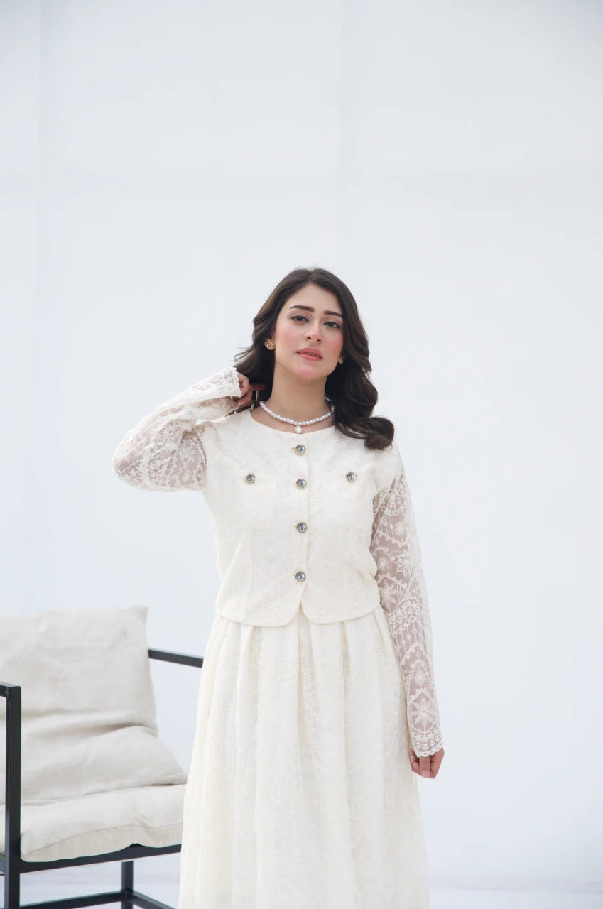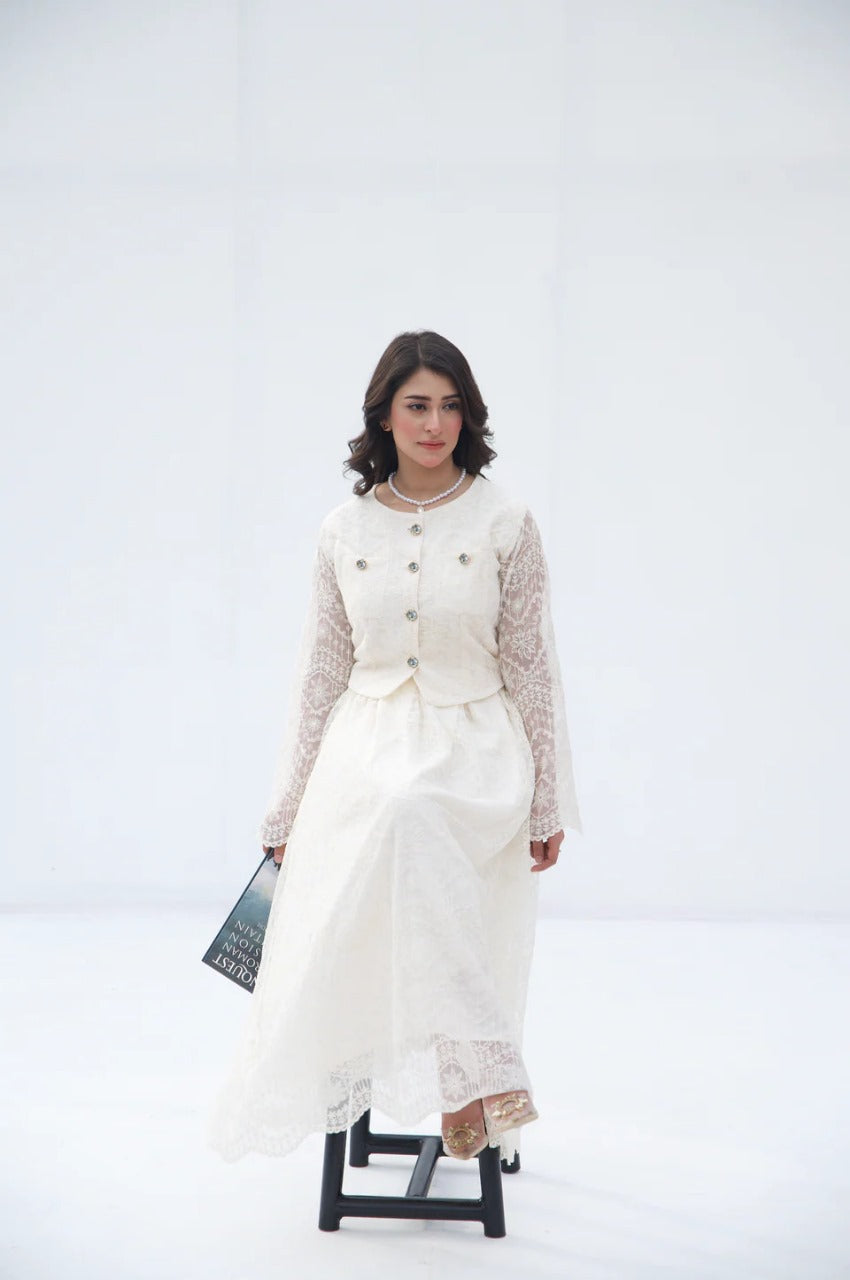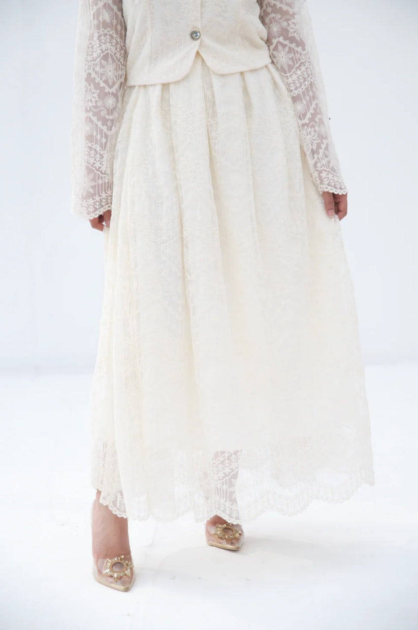 The 'Ivory Grace Two-Piece Set' from Parien House brings a vintage charm with a modern twist. This ensemble features intricate lace detailing across the outfit. The outerwear and skirt are fully lined except for the sleeves, maintaining a blend of modesty with a hint of allure. The outerwear is accentuated with functional buttons and pockets, while the skirt showcases elegant box pleats and a discreet side zipper for a seamless fit.