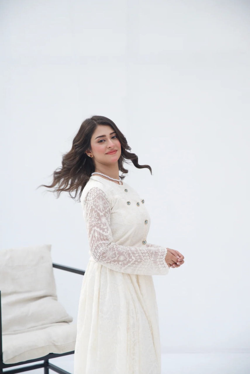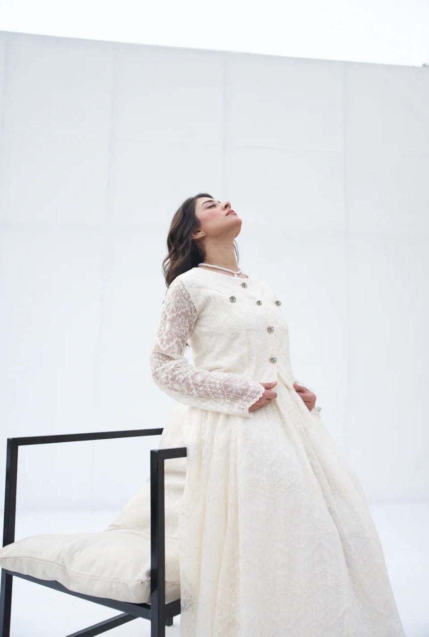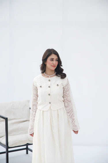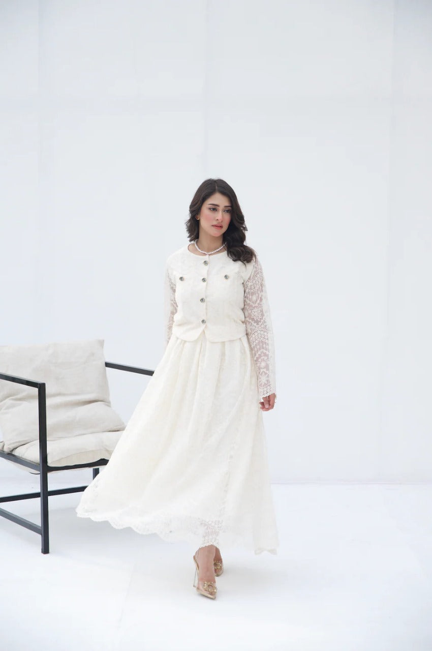 The 'Ivory Grace Two-Piece Set' from Parien House brings a vintage charm with a modern twist. This ensemble features intricate lace detailing across the outfit. The outerwear and skirt are fully lined except for the sleeves, maintaining a blend of modesty with a hint of allure. The outerwear is accentuated with functional buttons and pockets, while the skirt showcases elegant box pleats and a discreet side zipper for a seamless fit.