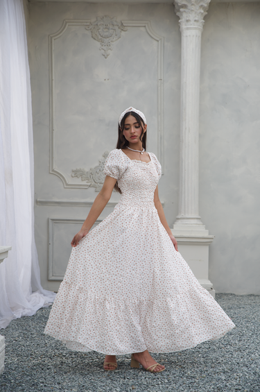Step into a world of subtle charm with the 'Floral Serenade Dress' from Parien House. This beautiful piece mirrors the design of our classic styles but comes in a unique color that adds a fresh touch to its timeless silhouette. Featuring a floral print on a light background, this dress boasts puff sleeves, a square neckline, and a smocked bodice for a flattering fit. The lightweight fabric and fluid design allow for elegant movement, making it perfect for both special occasions and casual wear.