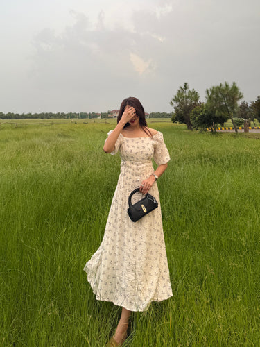 Introducing the 'Soft Whisper Dress' from Parien House, where timeless elegance meets contemporary chic. This dress is adorned with a subtle floral print, offering a whisper of romance and grace. Its off-the-shoulder design and gentle puff sleeves add a touch of allure, while the long, flowing skirt creates an effortlessly elegant silhouette. Crafted from lightweight fabric, this dress promises comfort and style for any occasion.
