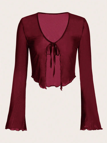 Lettuce Trim Trumpet Sleeve Mesh outwear Top