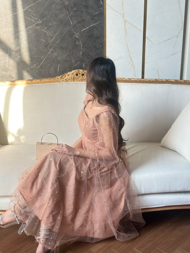 Dazzle under the stars with our "Starlight Glow Mesh Gown", crafted from lightweight mesh fabric adorned with shimmering star and glitter details. This dreamy gown features a soft blush hue, a square neckline, and flowy puffed sleeves, exuding romance and celestial charm.