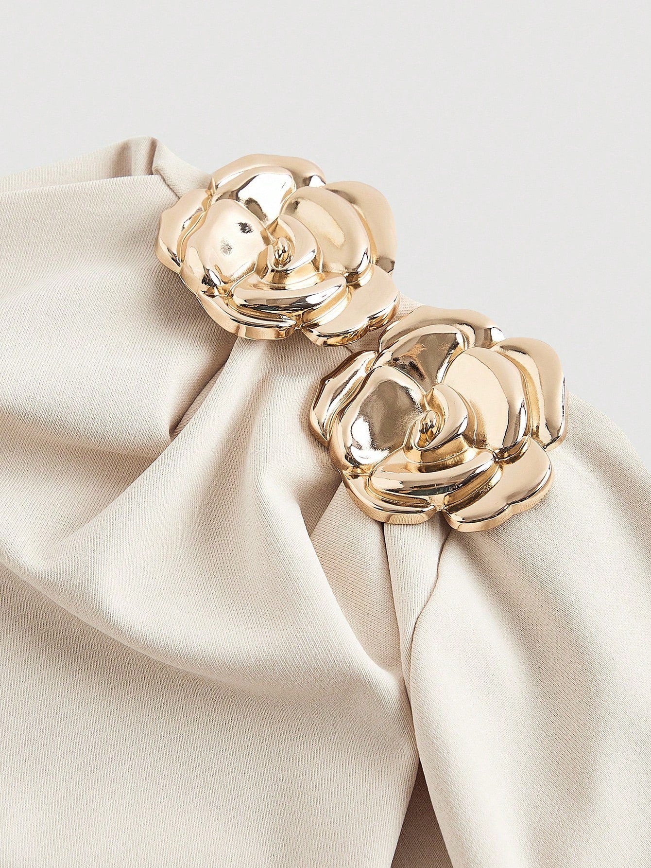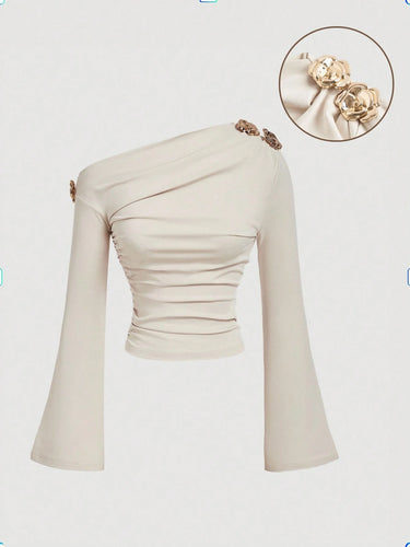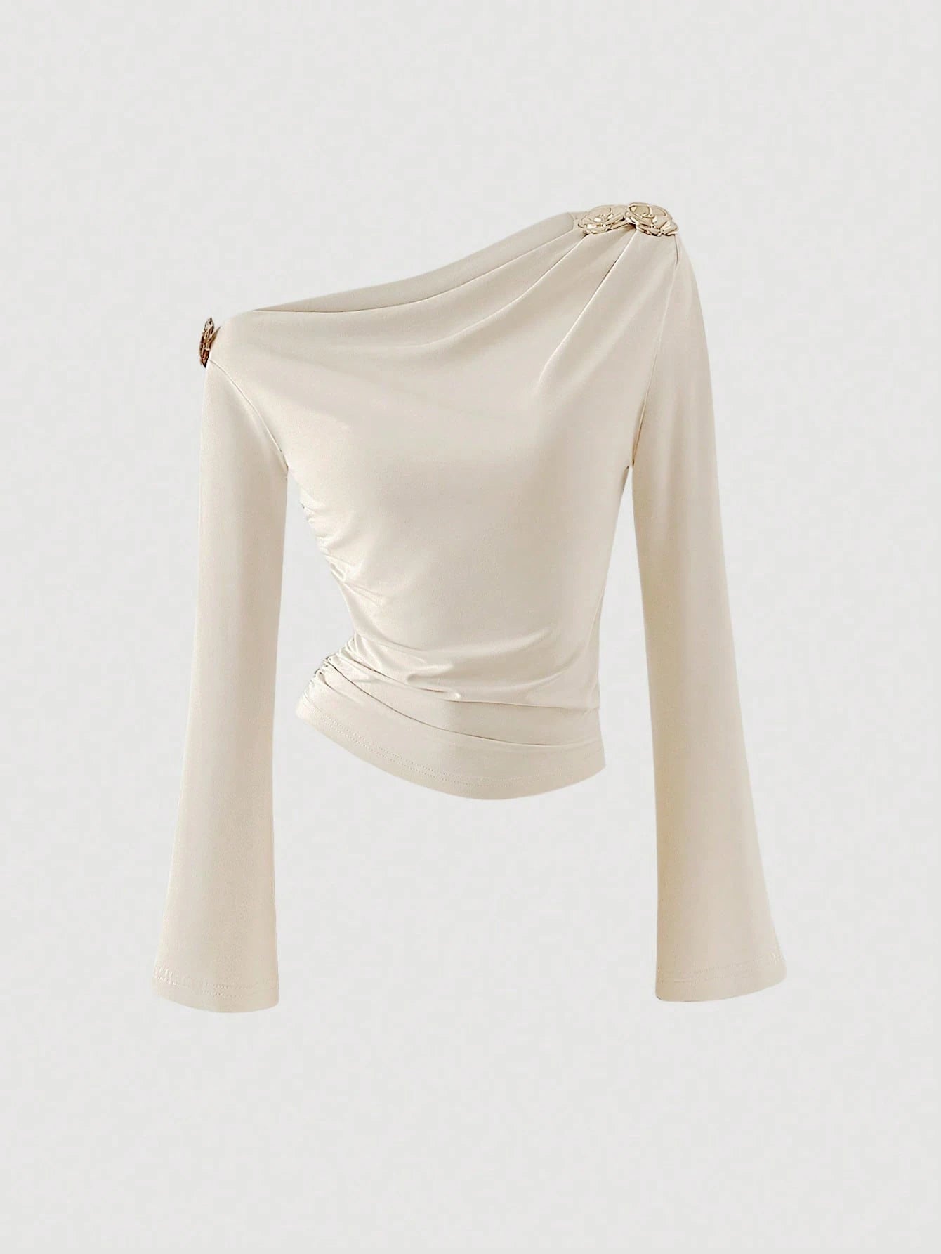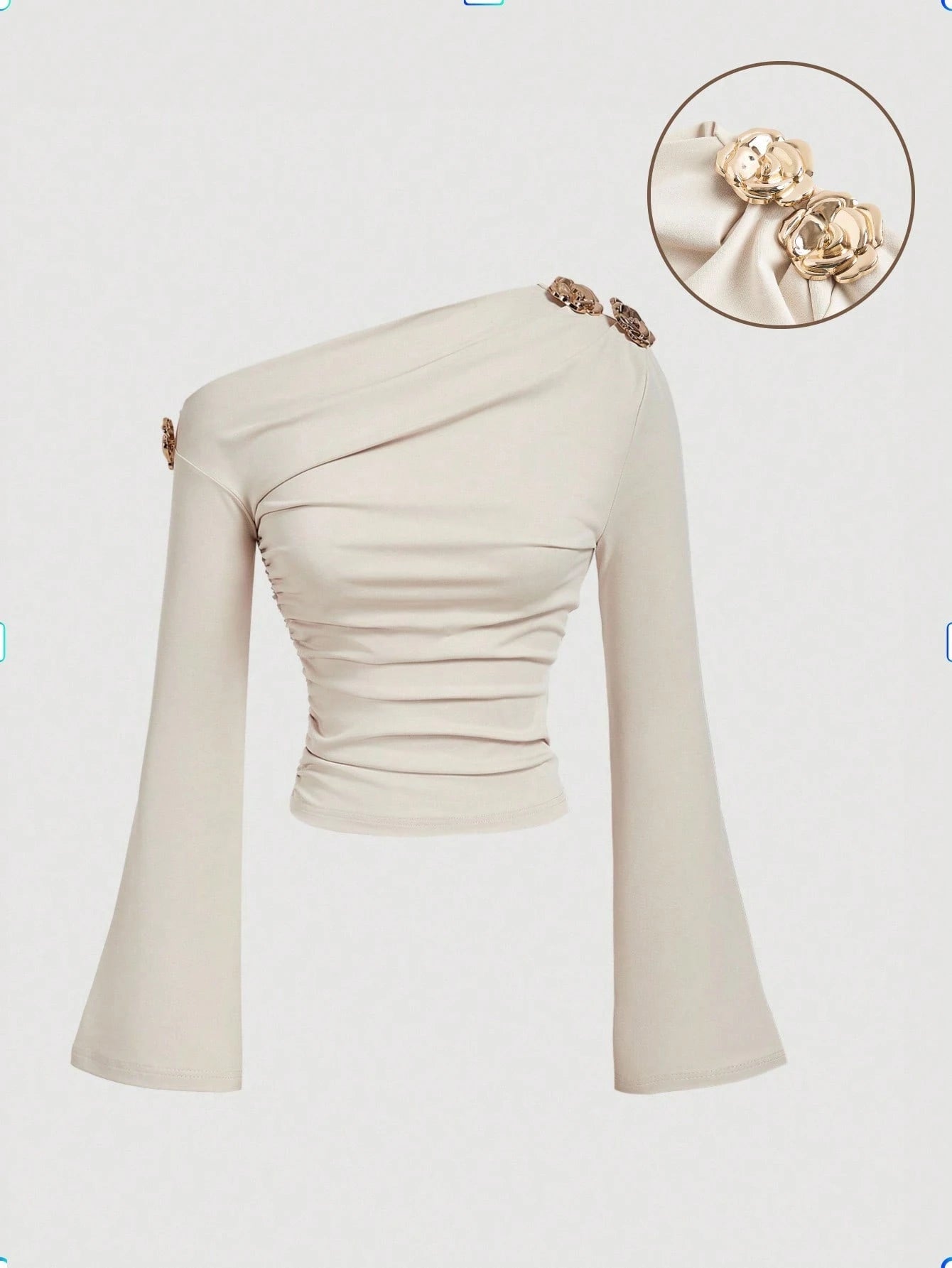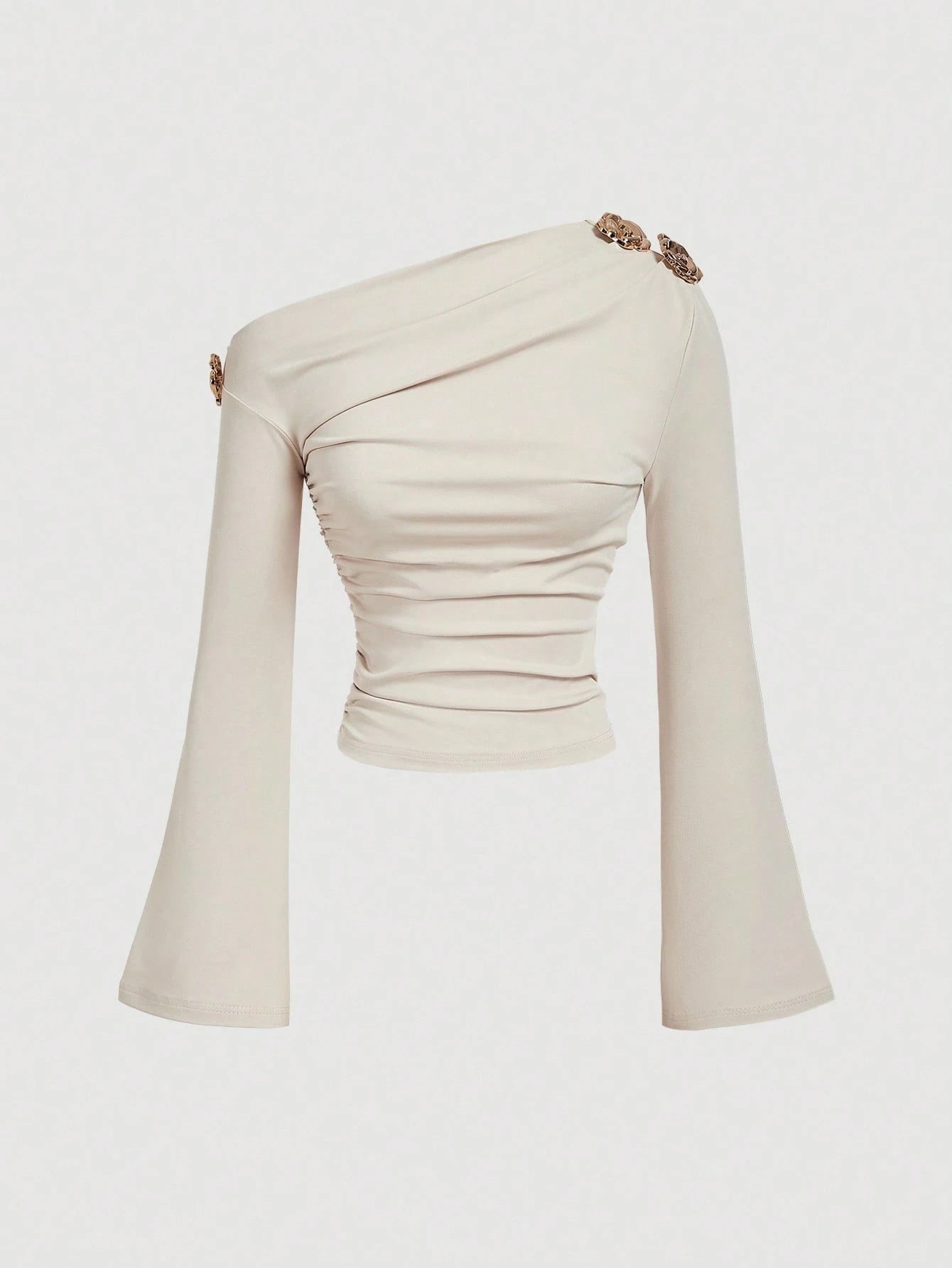 Metallic Decor Ruched Fitted Flare Sleeve T-Shirt