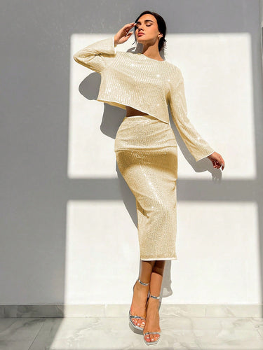 Parien Round Neck Long Sleeve Sequined Top And Skirt Set