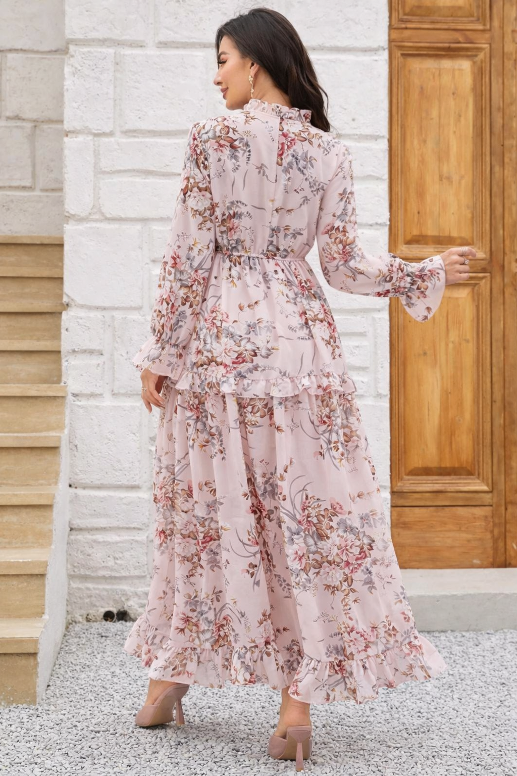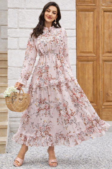 Floral Print Tie Neck Flounce Sleeve Ruffle Hem Dress