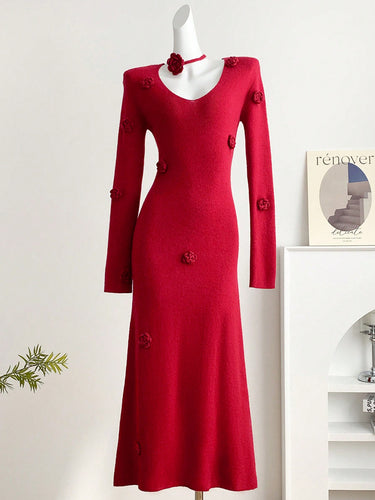 Parien 3D Floral Embellished Elegant Christmas Sweater Dress