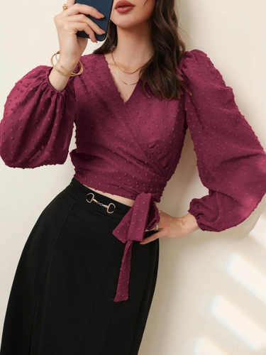 Parien Swiss Dot Surplice Front Tie Side Blouse is an elegant and stylish blouse that comes in various colors including dusty pink, burgundy, yellow, and black. Made from a high-quality fabric, this blouse features a surplice front with a tie side, creating a flattering and feminine silhouette. The Swiss dot pattern adds a subtle texture to the plain fabric, while the elegant style makes it perfect for both formal and casual occasions. Pair it with high-waisted pants or a skirt to complete the look.