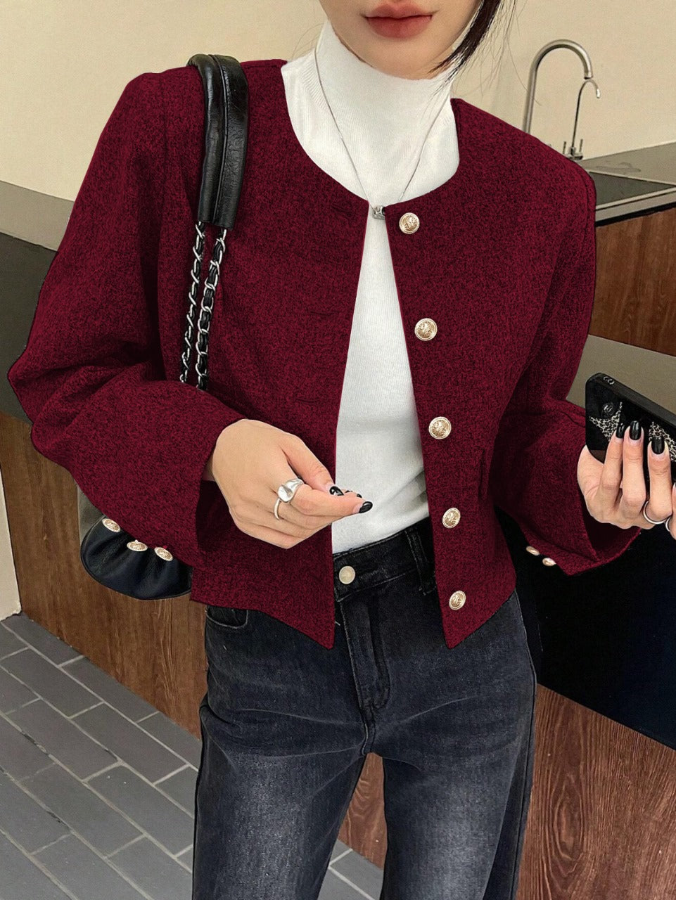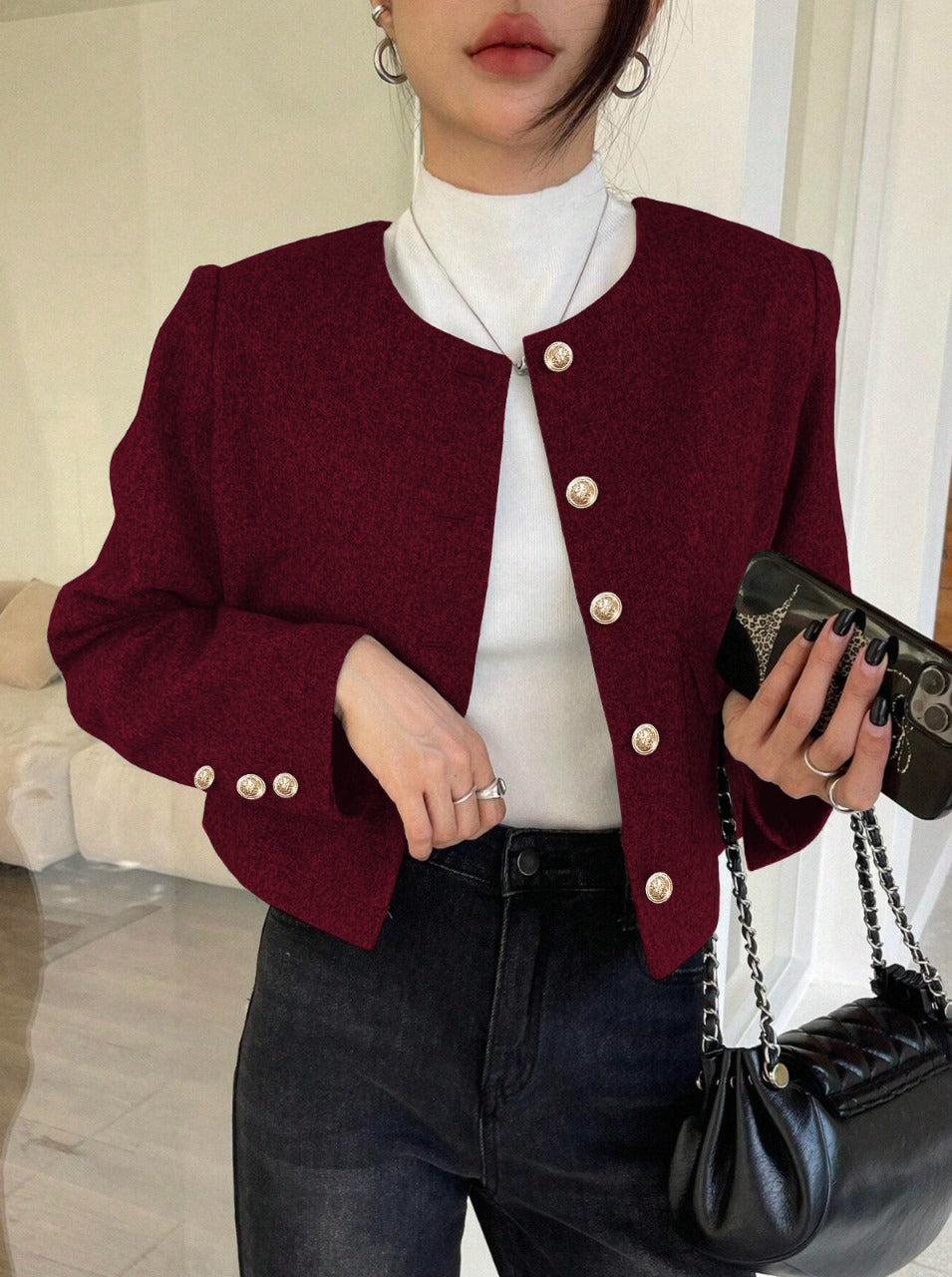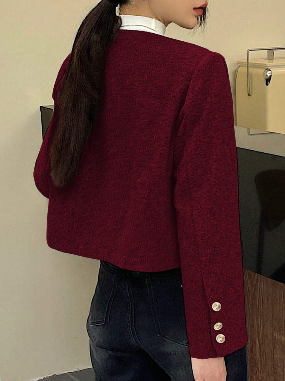 Burgundy Single-Breasted Pocket Short Jacket