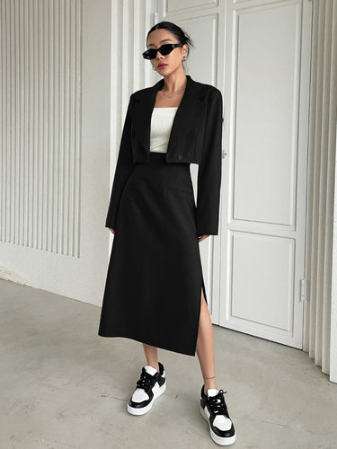 Lapel Neck Crop Blazer & Split Thigh Skirt