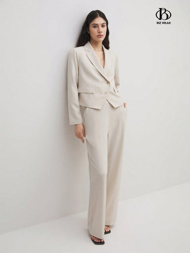 The blazer features a tailored fit with a notched lapel and button closure, offering a sophisticated look perfect for formal or professional settings. The wide-leg pants add a modern touch, creating a balanced silhouette that exudes confidence and style. Ideal for office wear, business meetings, or chic evening events.