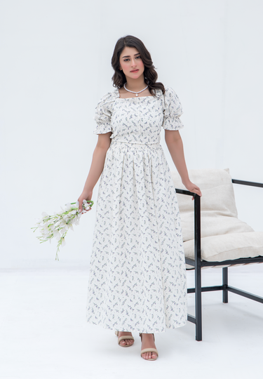 Celebrate the beauty of nature and elegance with the 'Meadow Muse Two-Piece Set' from Parien House. This charming ensemble pairs a fitted top with puff sleeves and a square neckline that beautifully frames the decolletage, with a flowing skirt that enhances its feminine appeal. Crafted from a soft, lightweight fabric adorned with a delicate floral print, this set offers both comfort and style, making it perfect for seasonal gatherings or leisurely afternoon teas.