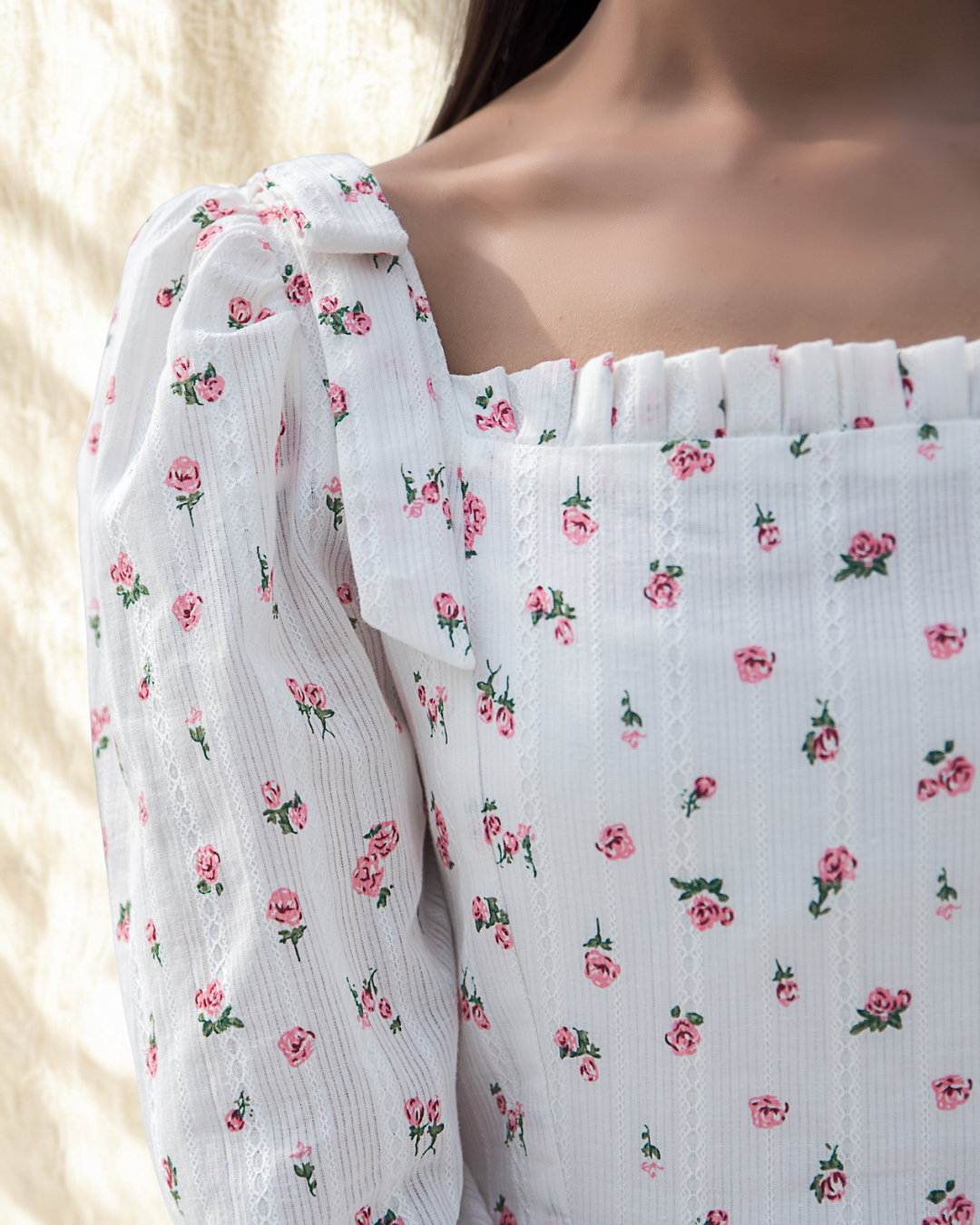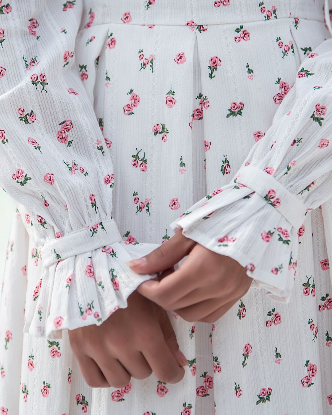 The 'Cottage Bloom Dress' from Parien House captures the essence of pastoral charm and elegance. Made from soft, breathable cotton, this dress is adorned with delicate floral prints and frilly accents, offering a whimsical touch. It features a frilled neckline, frilled cuffs with buttons, and a convenient back zipper for ease of wear. The soft frills and gentle draping of the fabric make it perfect for a graceful, feminine look.