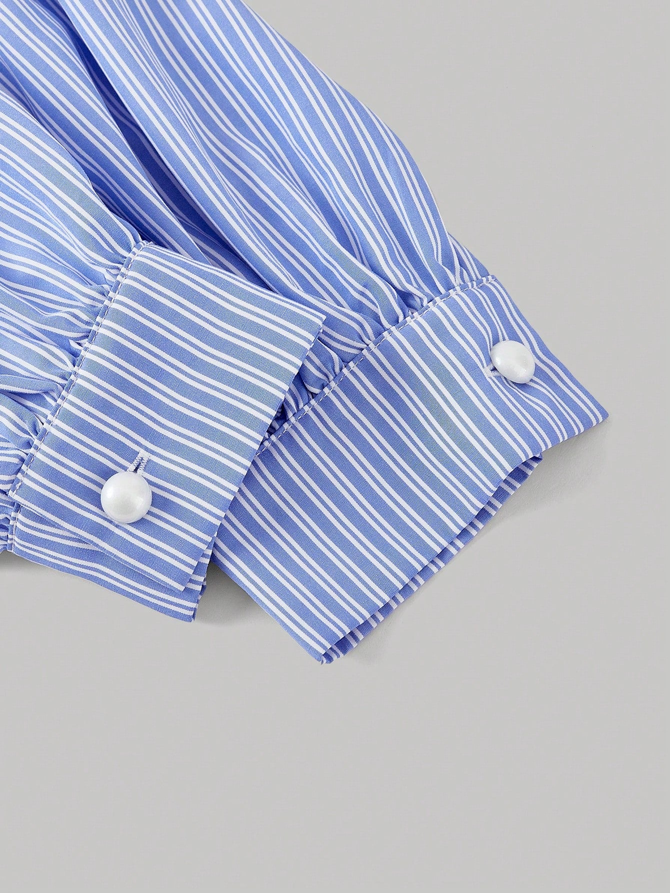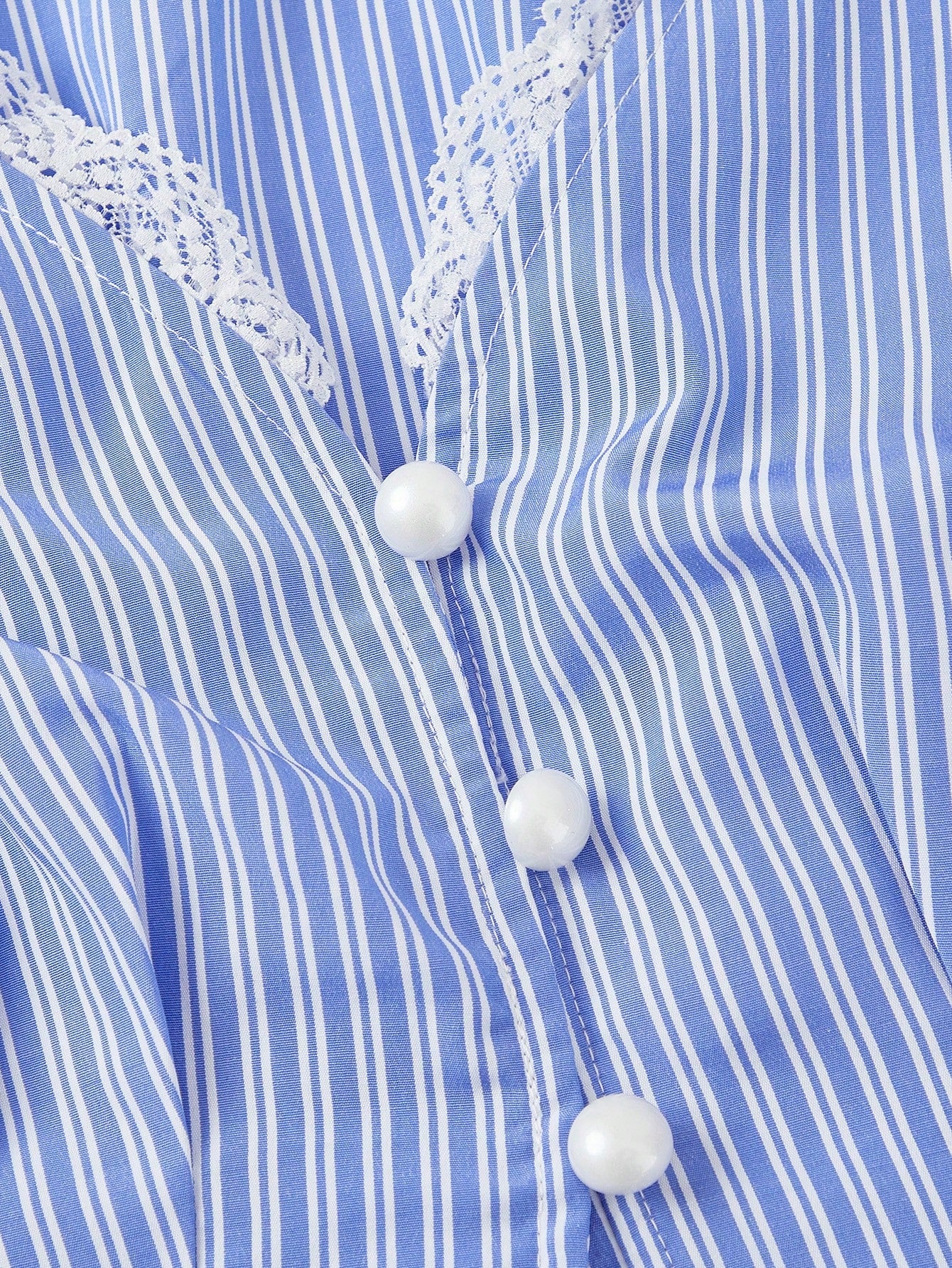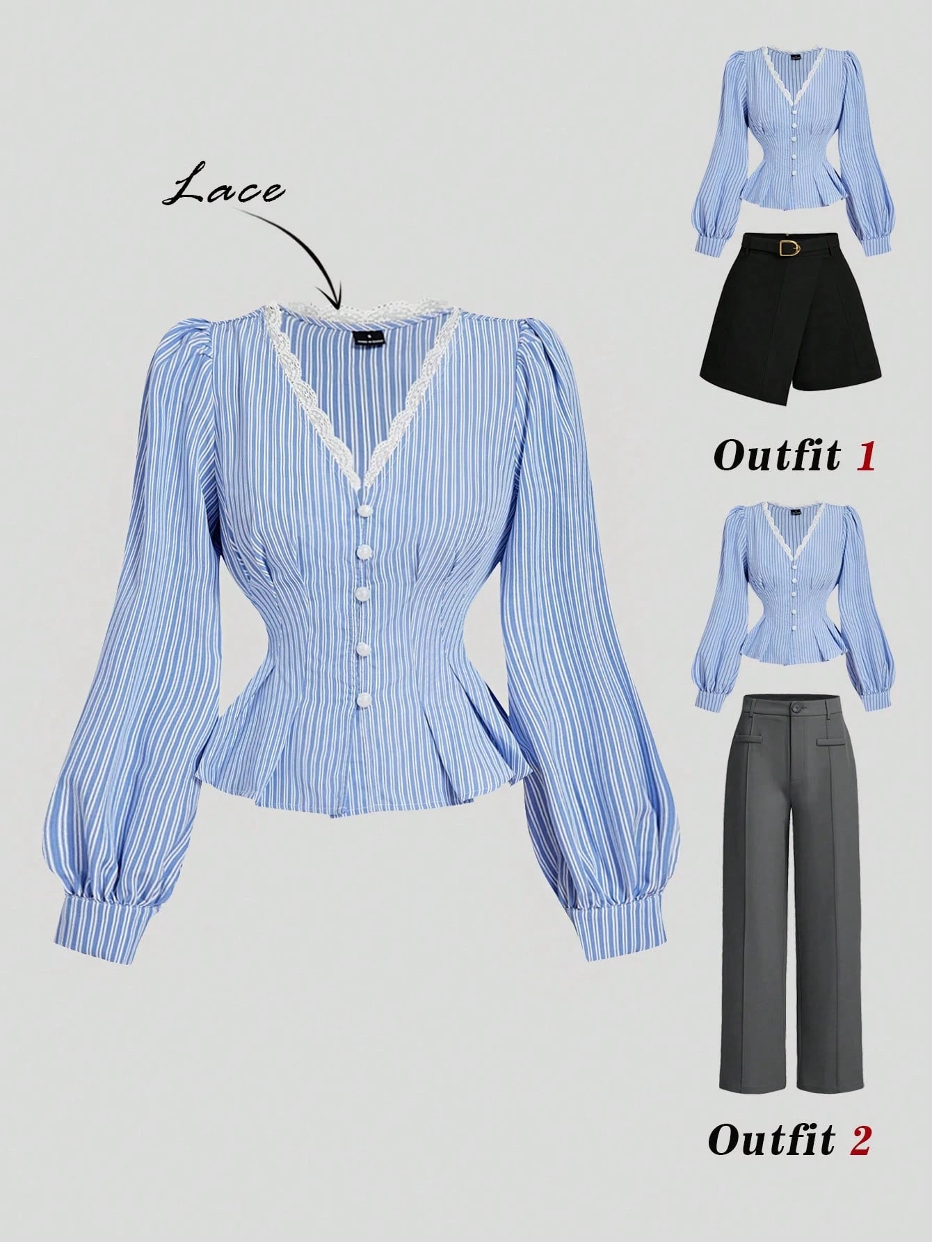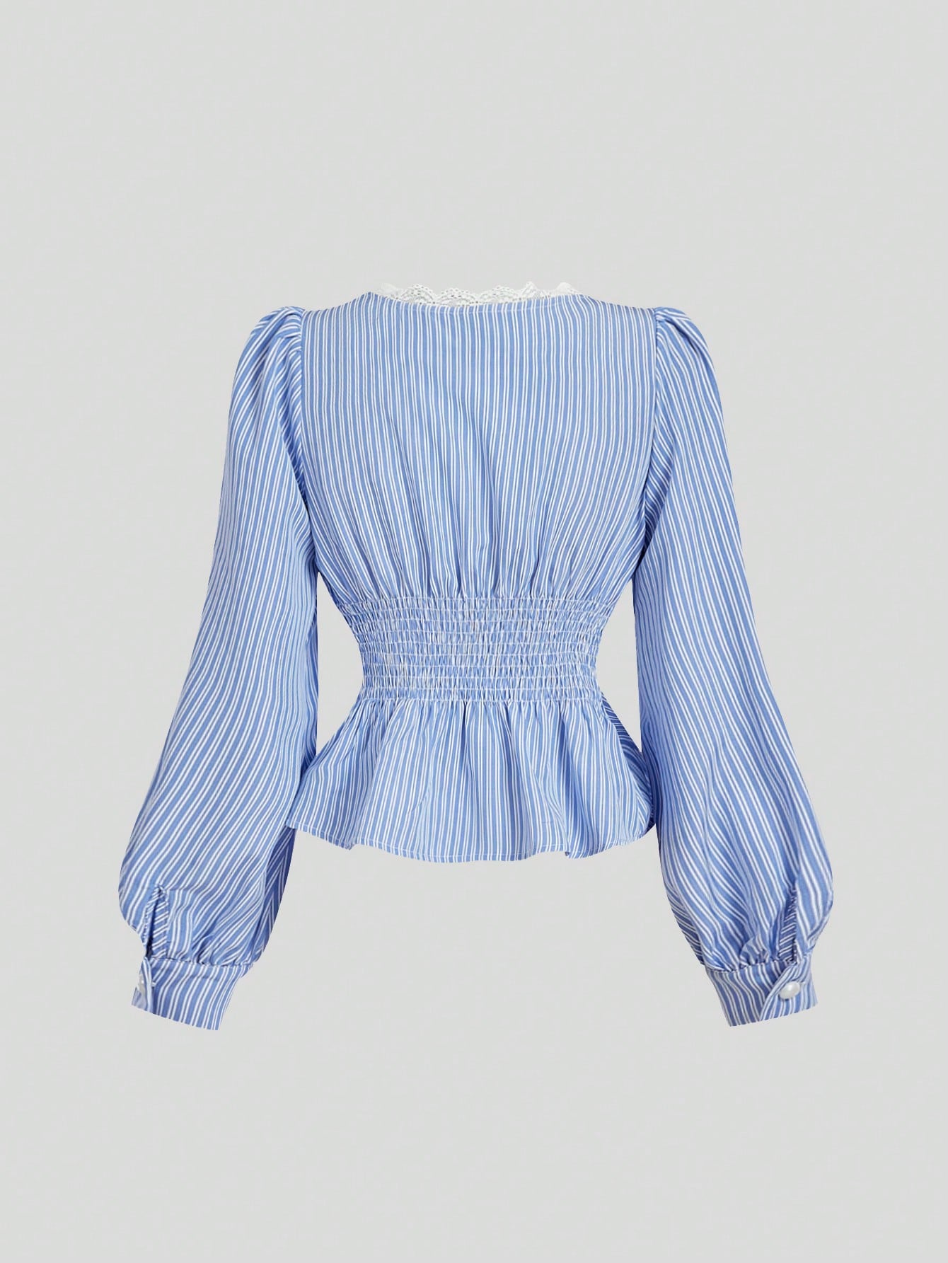 Contrast Lace Button Design Striped Lantern Sleeve Blouse
