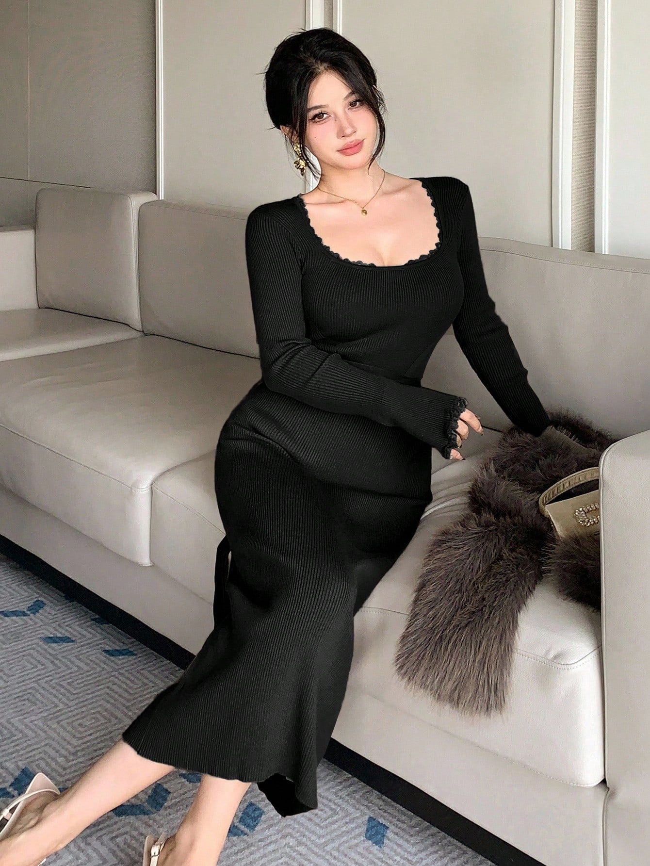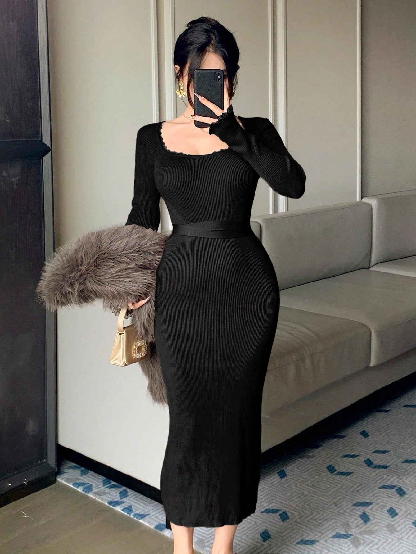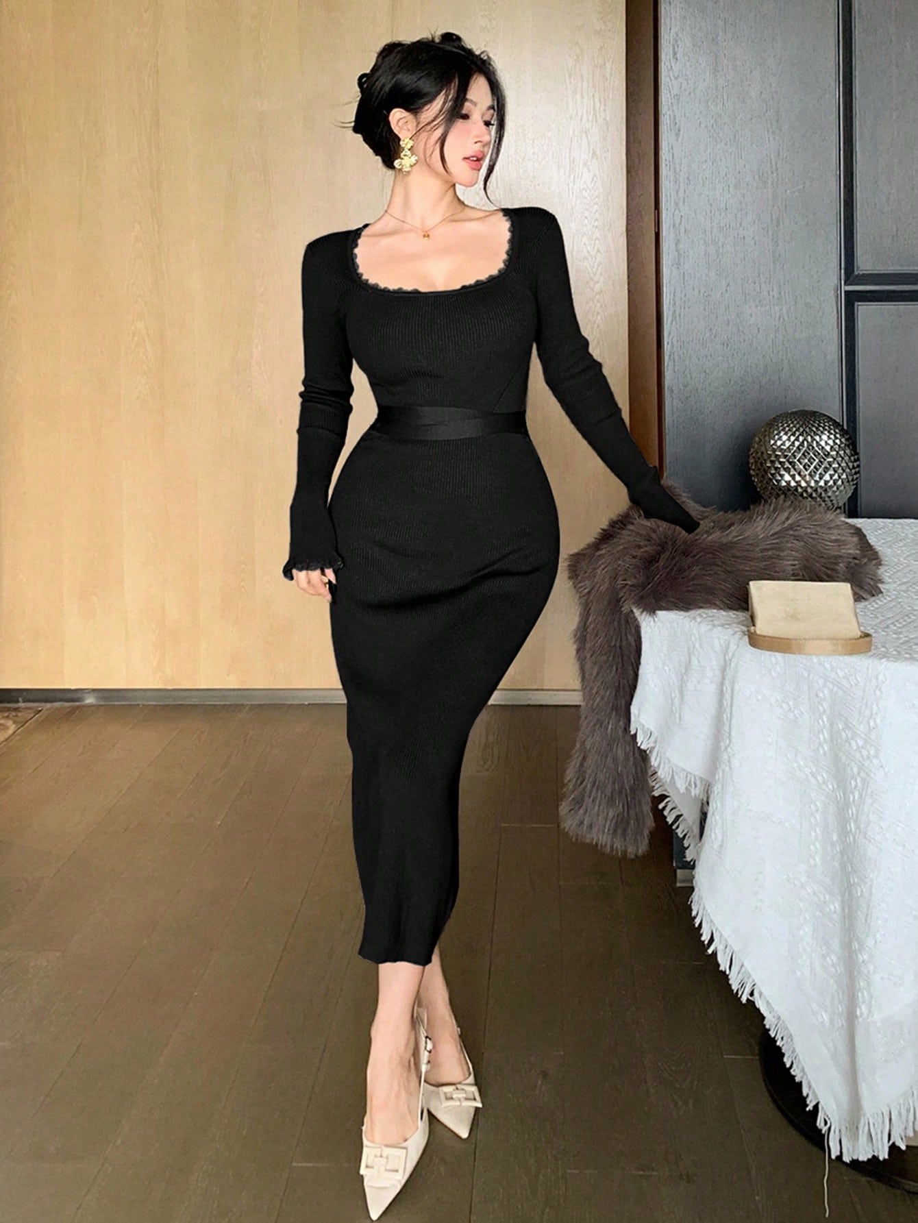 Elegant Fitted Lace Patchwork Flare Sleeve Cinched Waist Dress