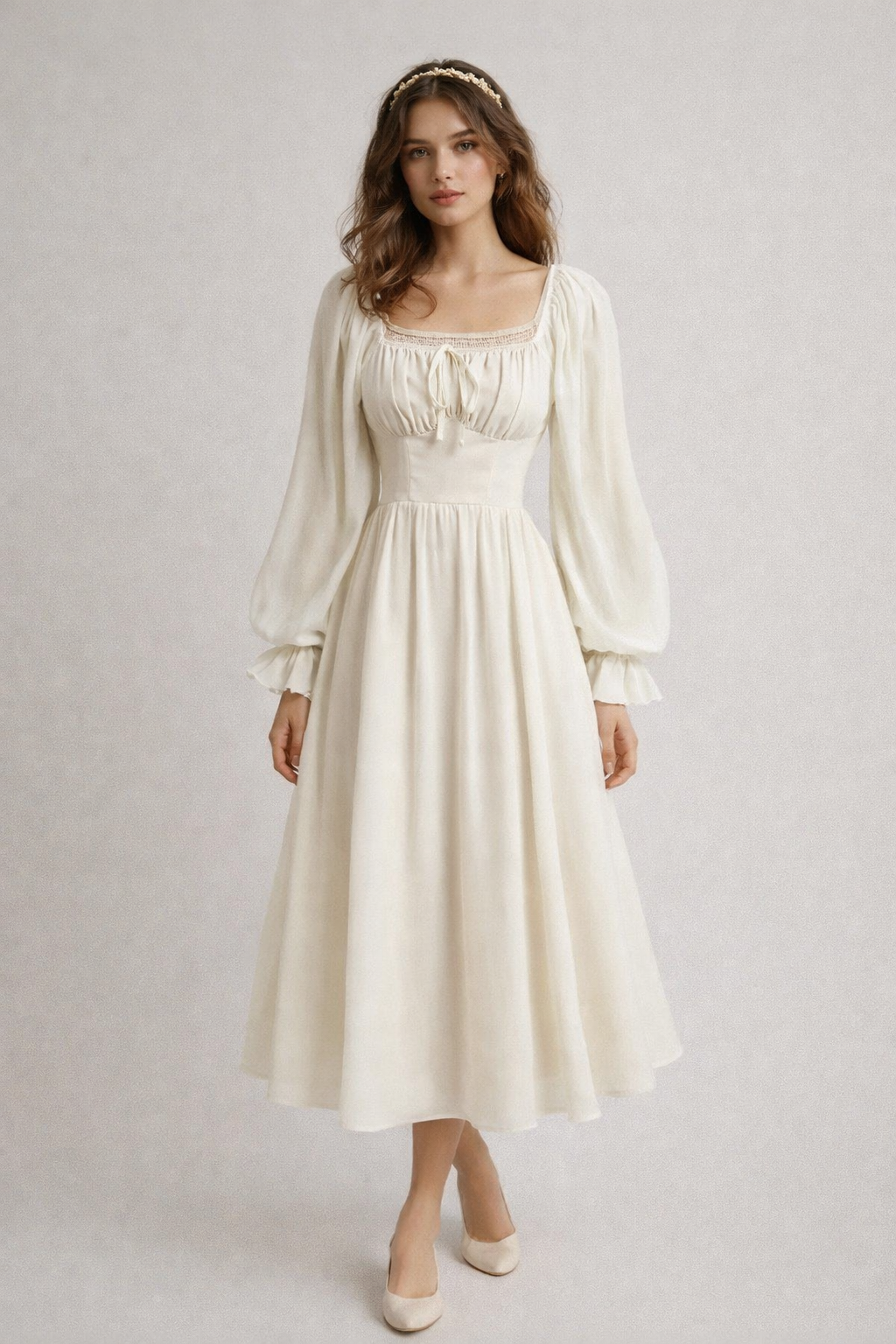 Step into a world of timeless beauty with our "Ivory Grace Cottagecore Dress", a stunning piece inspired by vintage elegance. This dress features a flattering empire waist, a soft square neckline with a delicate drawstring detail, and voluminous puffed sleeves for a romantic touch. The flowing midi-length skirt adds a graceful silhouette, making it perfect for weddings, garden parties, or any special occasion.