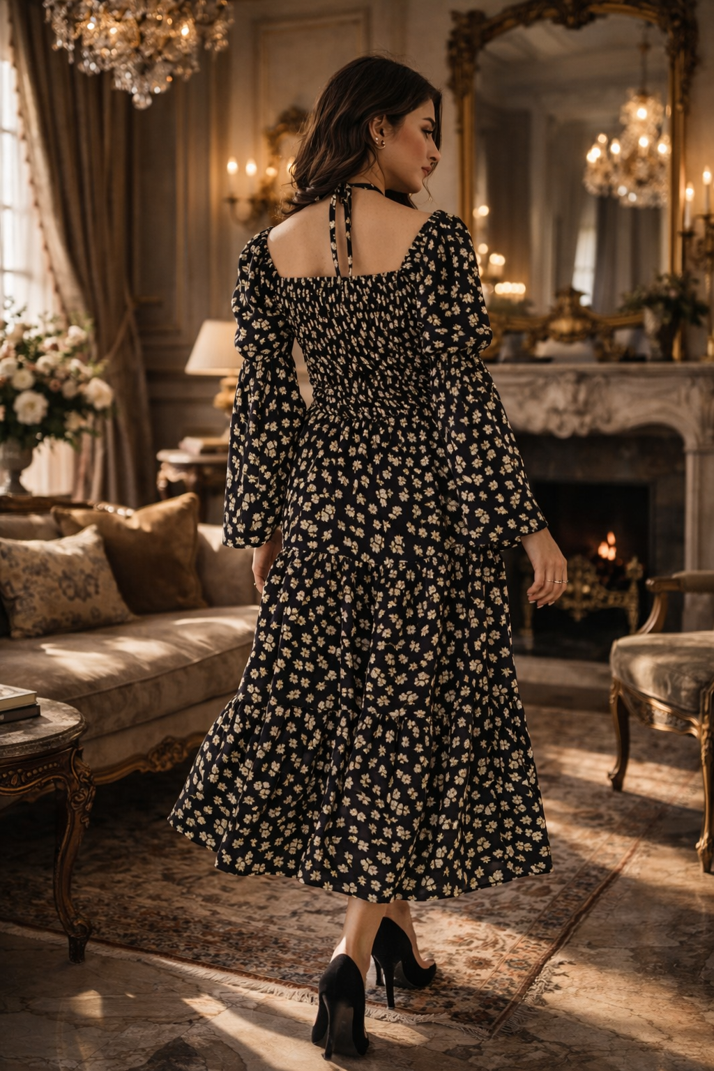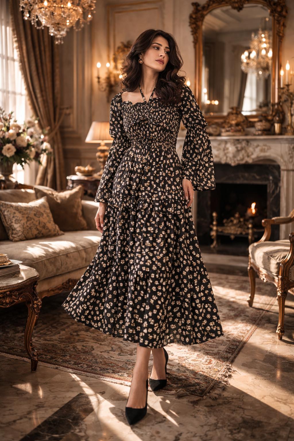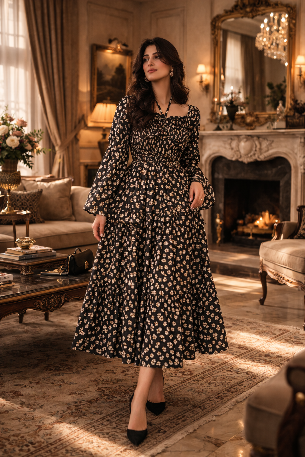 Step into a world of effortless elegance with the Parien Nocturnal Bloom Dress. This stunning floral dress is designed for modern romantics, featuring a beautifully smocked bodice that contours perfectly, playful tiered ruffles for a flowy silhouette, and voluminous sleeves that add a touch of vintage charm. Crafted from soft, breathable fabric, it offers both comfort and grace, making it ideal for garden soirées, brunch dates, or moonlit walks. Let your style bloom! 🌙✨