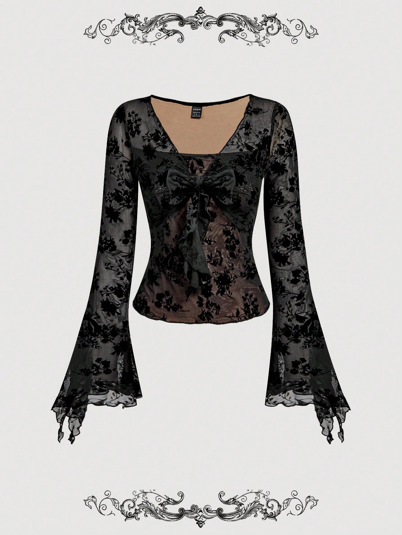 V-Neck Flared Sleeve Ruched Waist Flocked Black T-Shirt